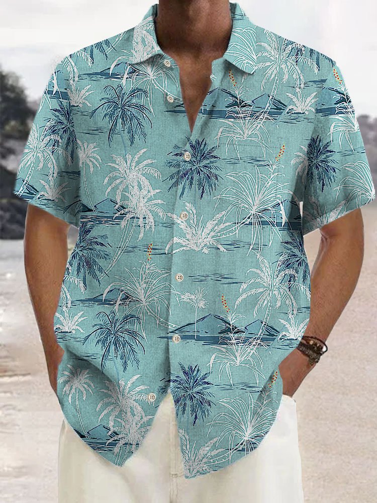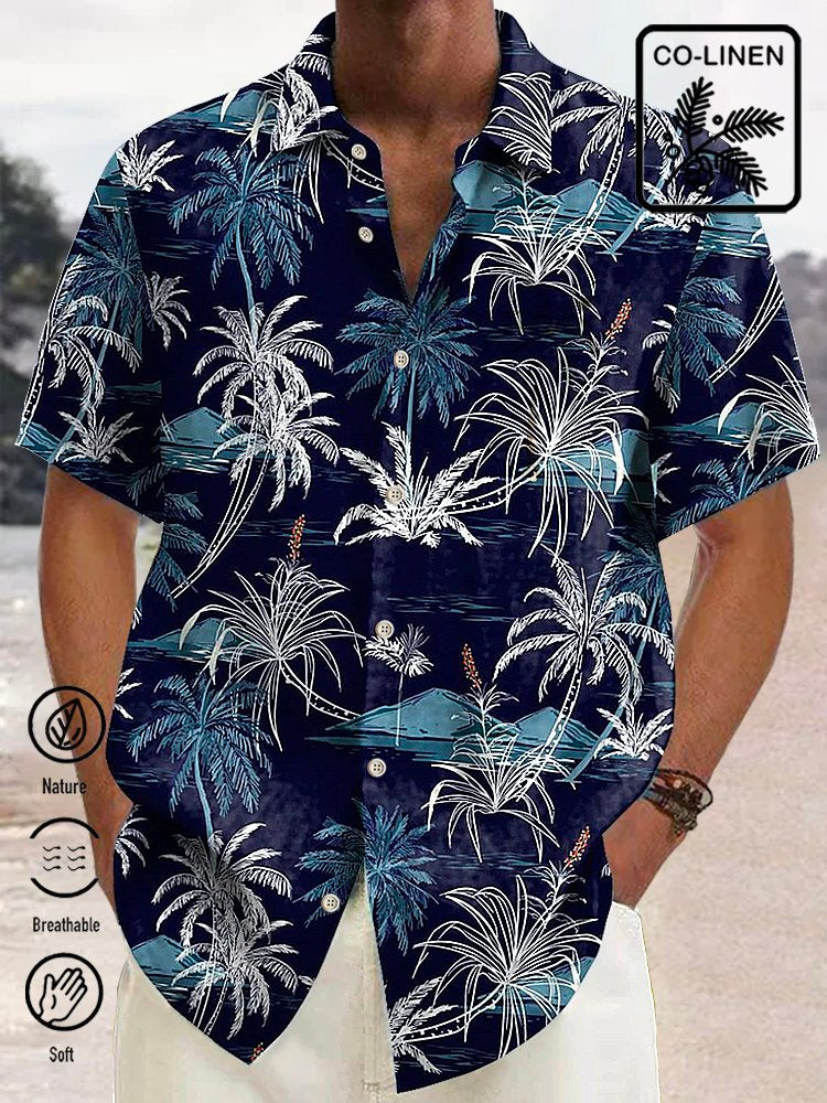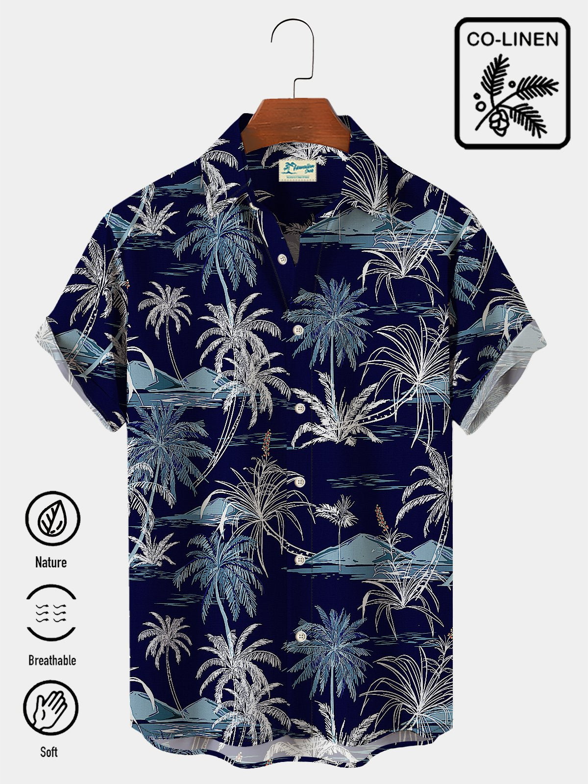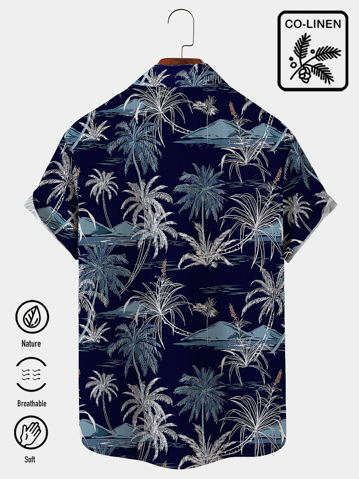Camisa hawaiana de lino con estampado de árboles de coco azules y bolso en el pecho de Alohadaddy, camisa festiva de talla grande