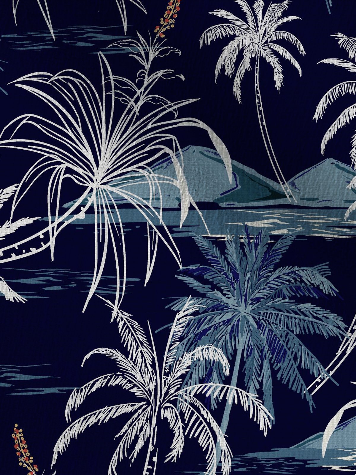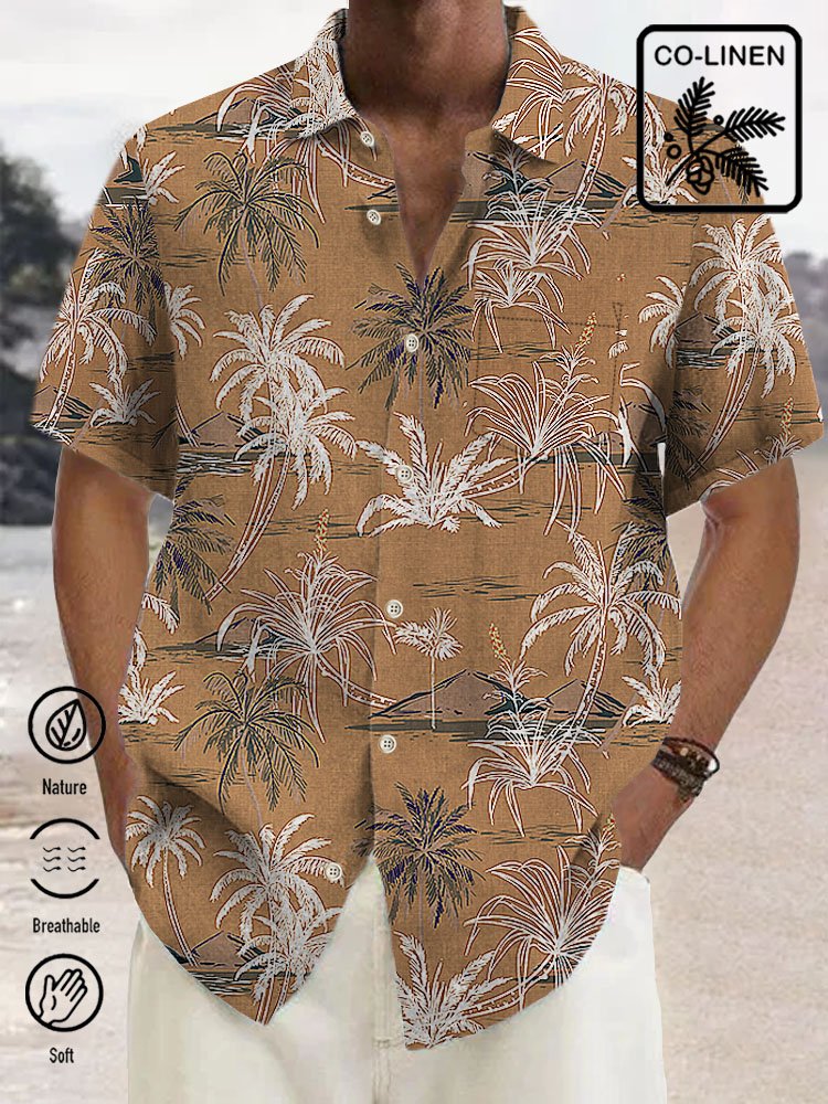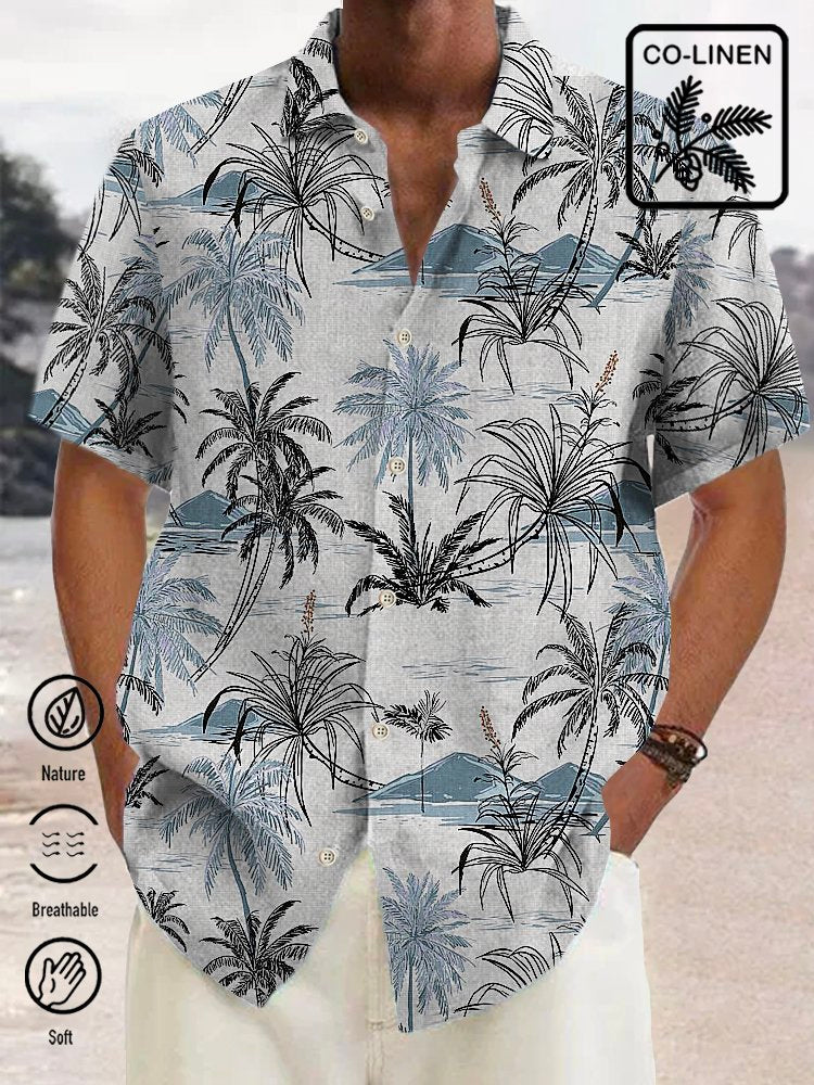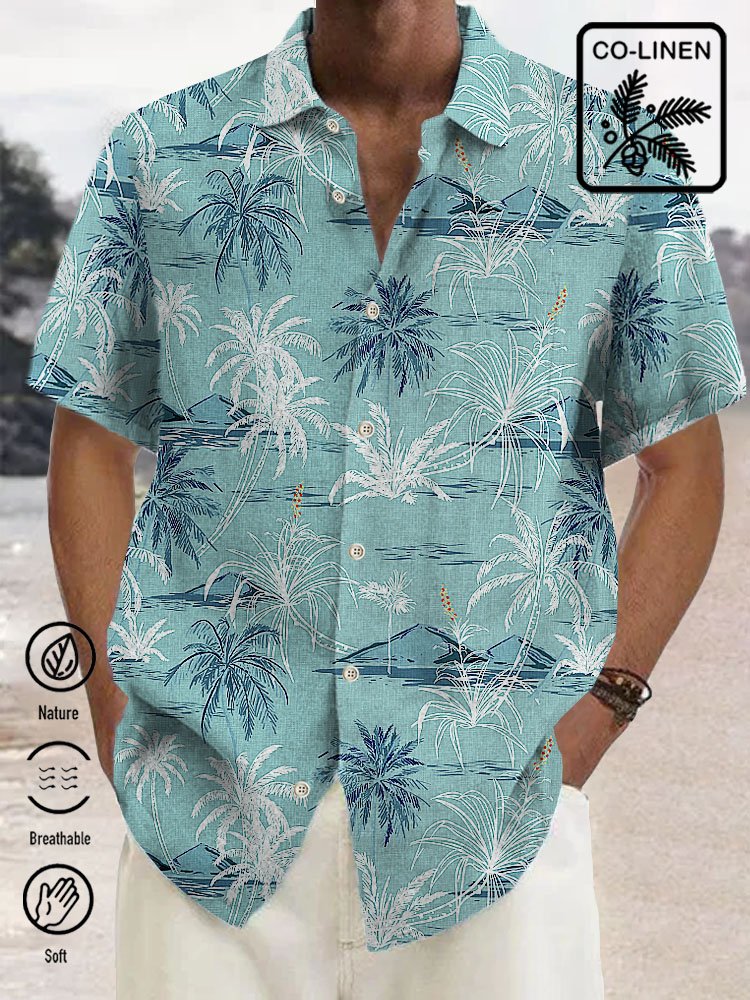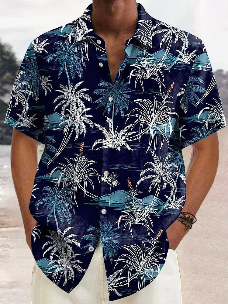 Camisa hawaiana de lino con estampado de árboles de coco azules y bolso en el pecho de Alohadaddy, camisa festiva de talla grande