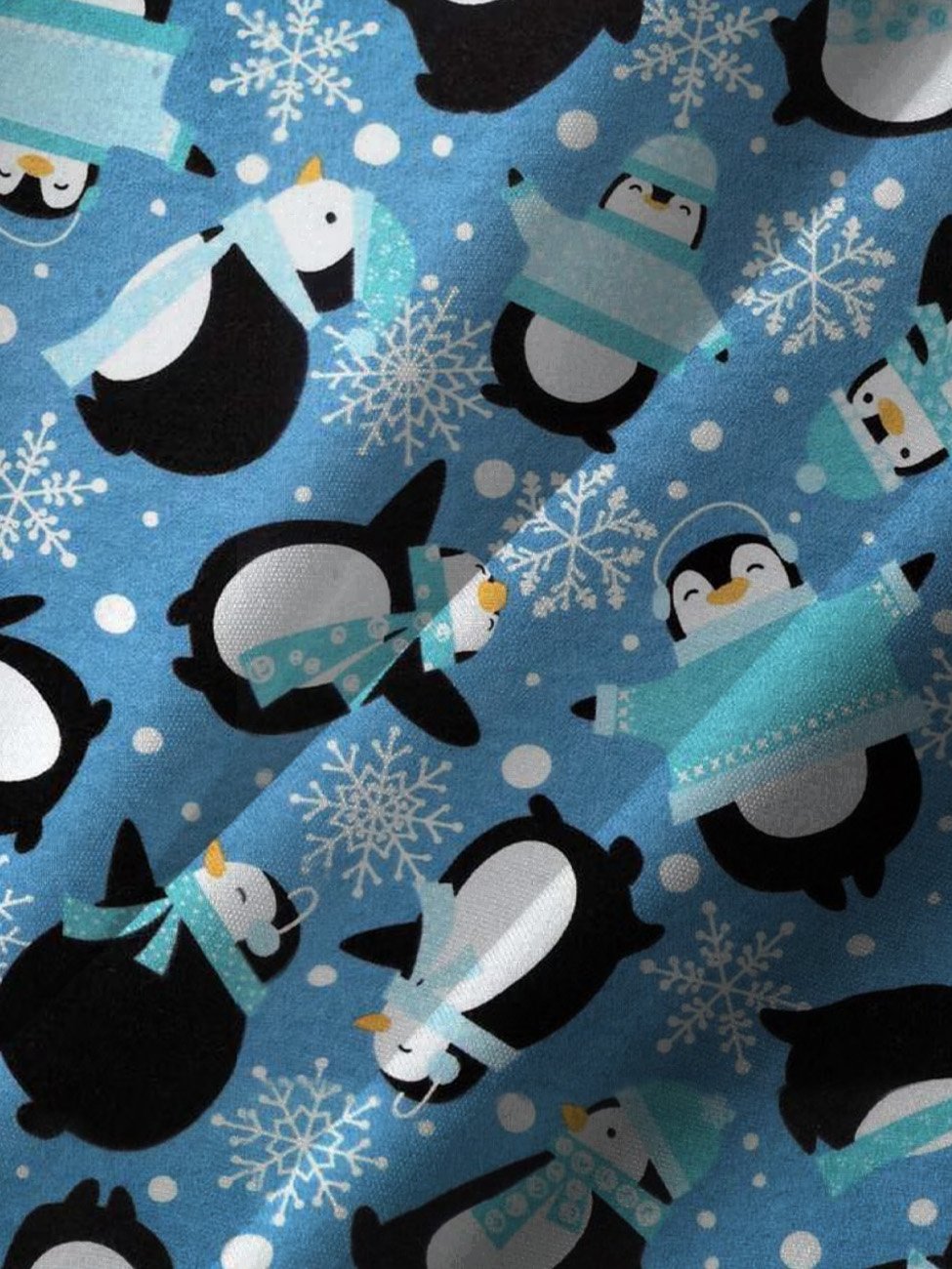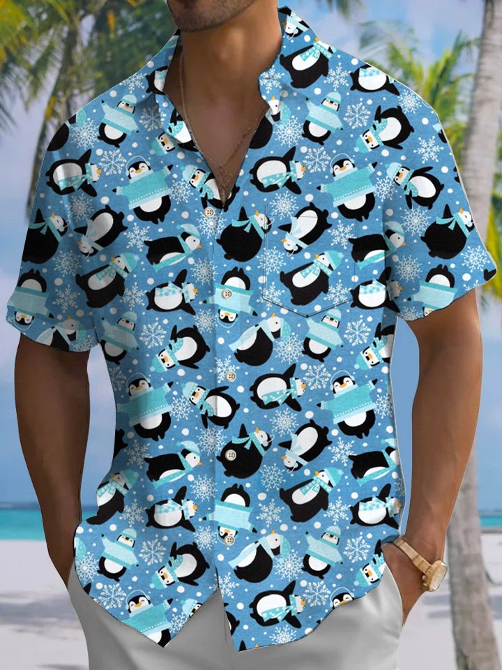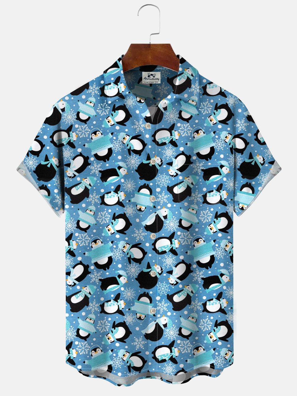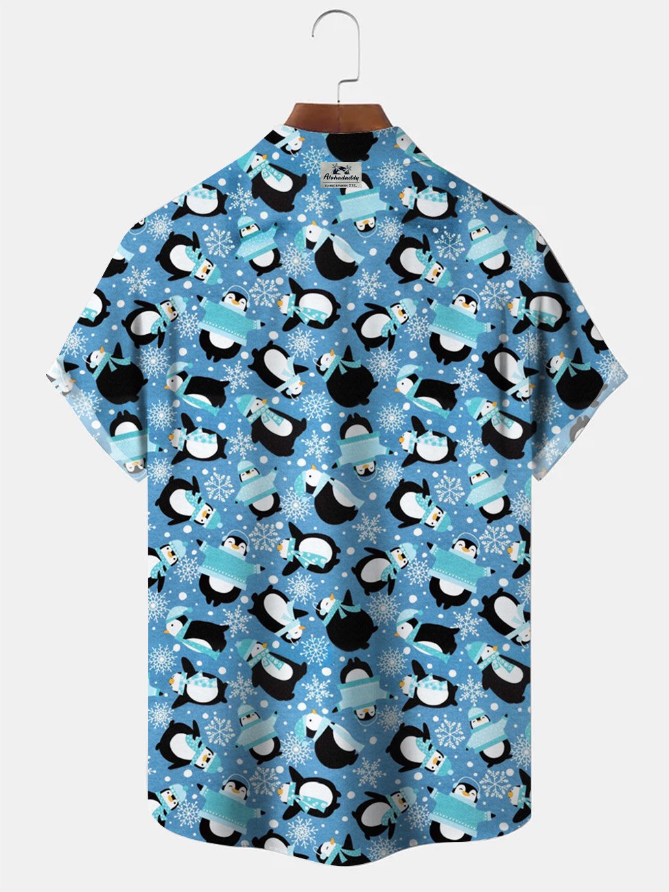 Camisa informal de manga corta con bolsillo abotonado y diseño de pingüino y muñeco de nieve navideño de Alohadaddy