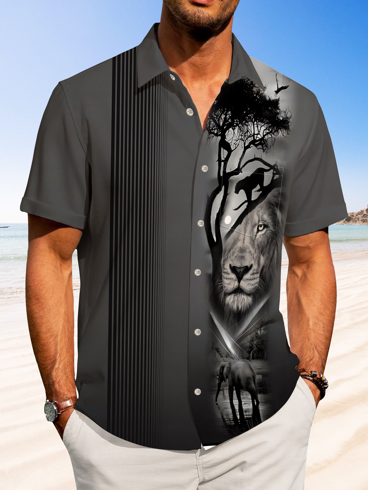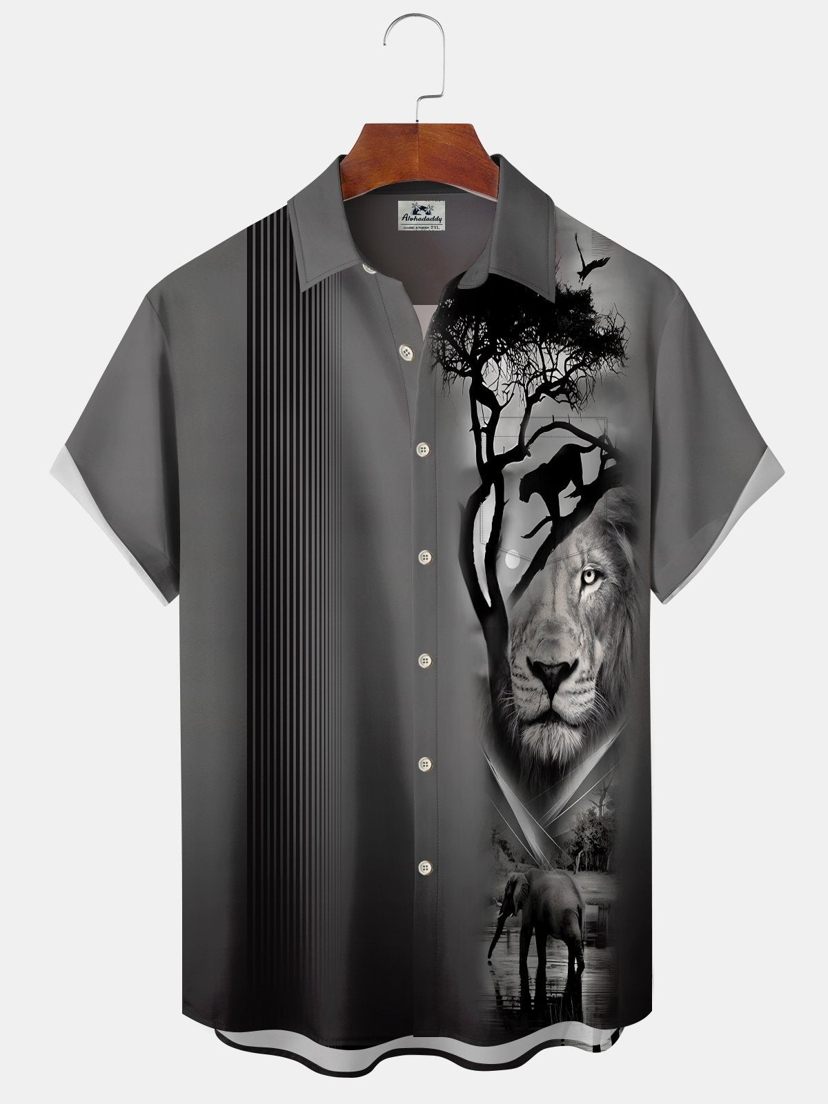 Alohadaddy Casual Stripes Lion Art Print Button Cardigan Pockets Stretch Oversized Short Sleeve Shirt