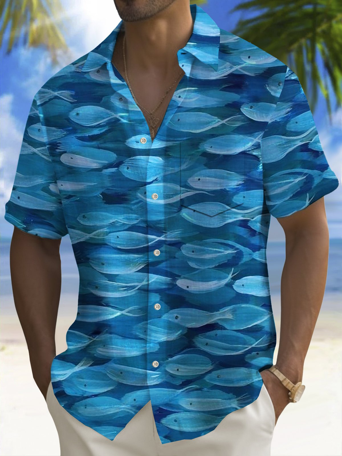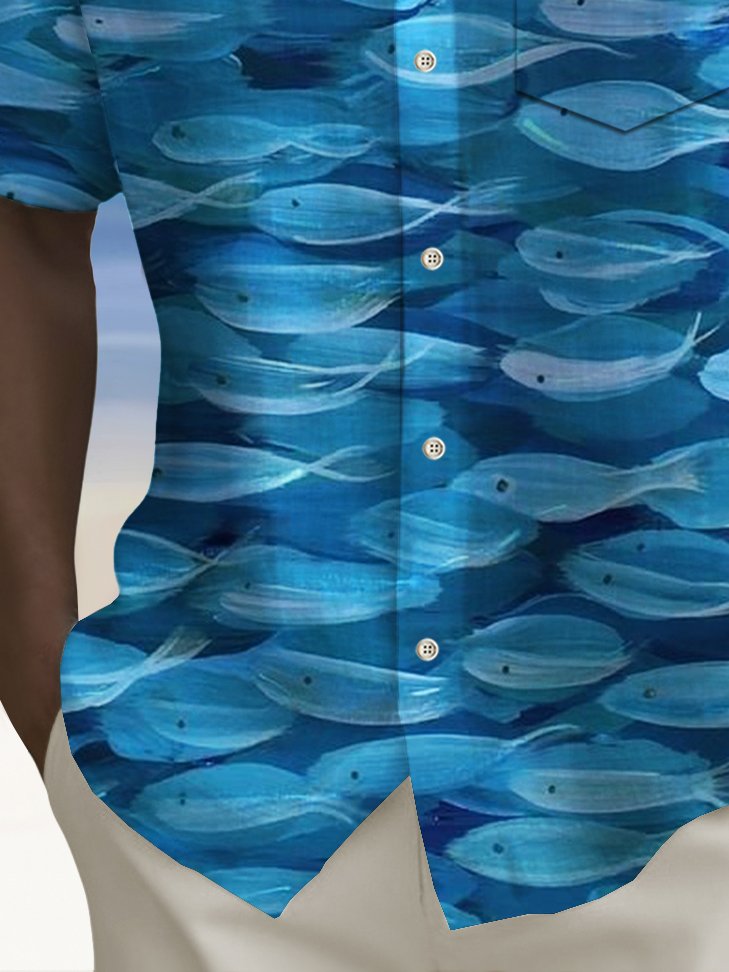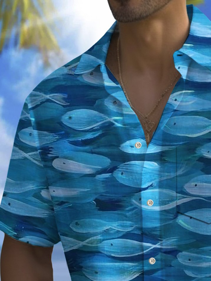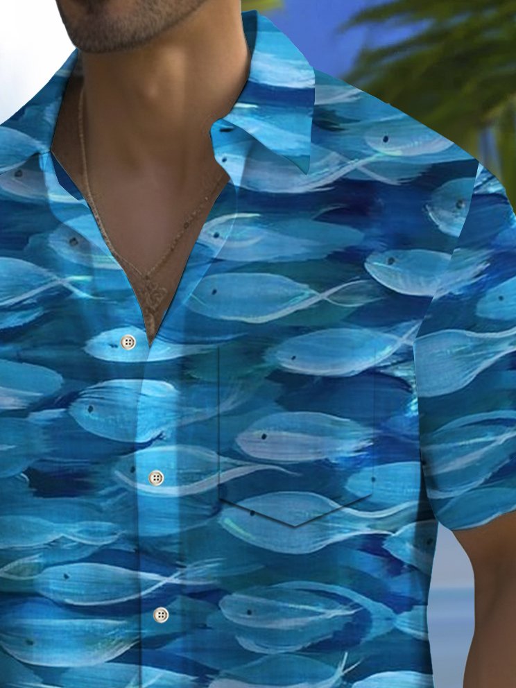 Camisa hawaiana con estampado de peces y bolsillo para acampar para hombre de Alohadaddy Beach Vacation, talla grande