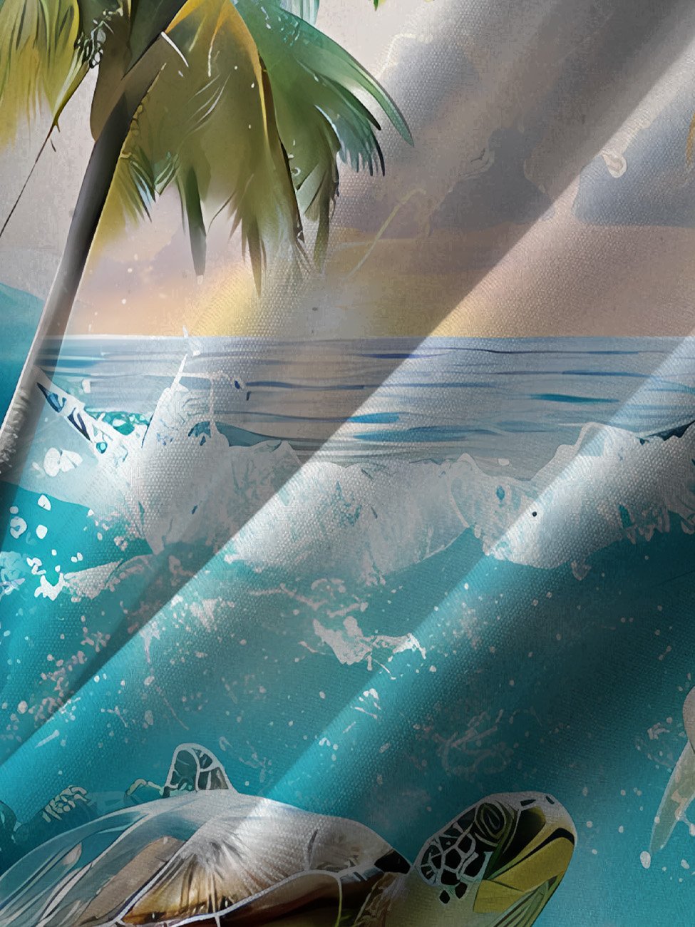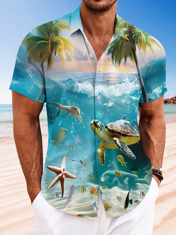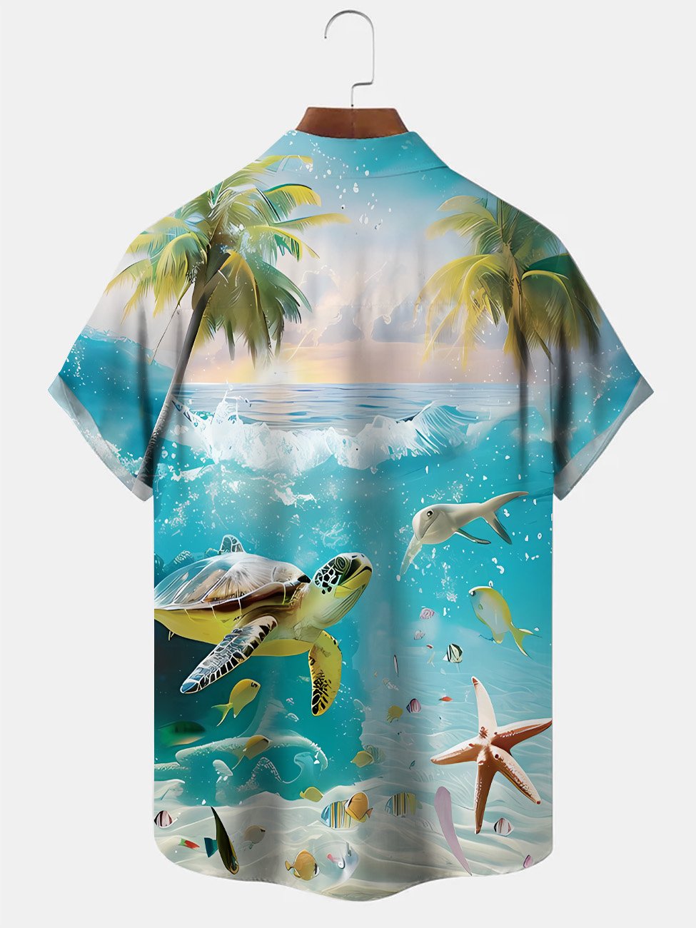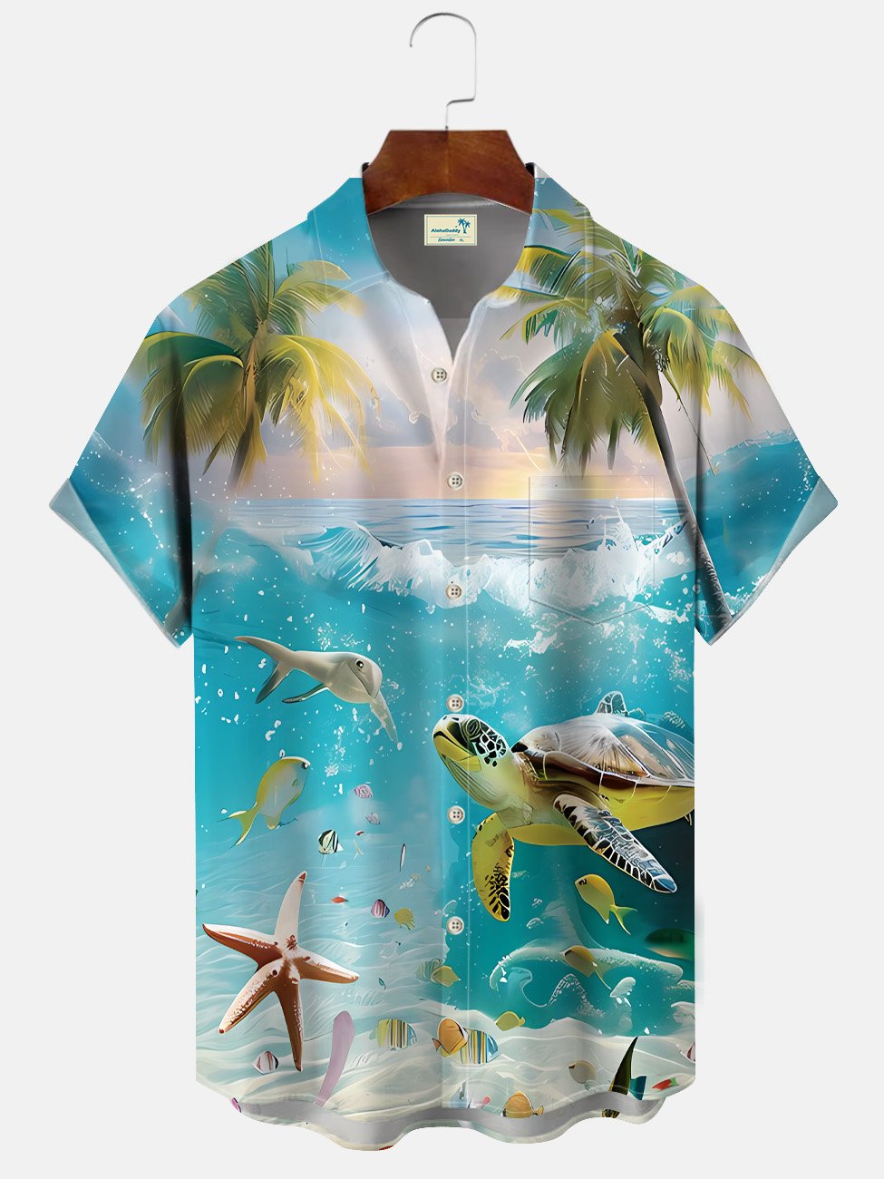 Camisa informal de manga corta de poliéster para hombre con botones y bolsillo con diseño de tortuga y peces marinos de verano de Alohadaddy