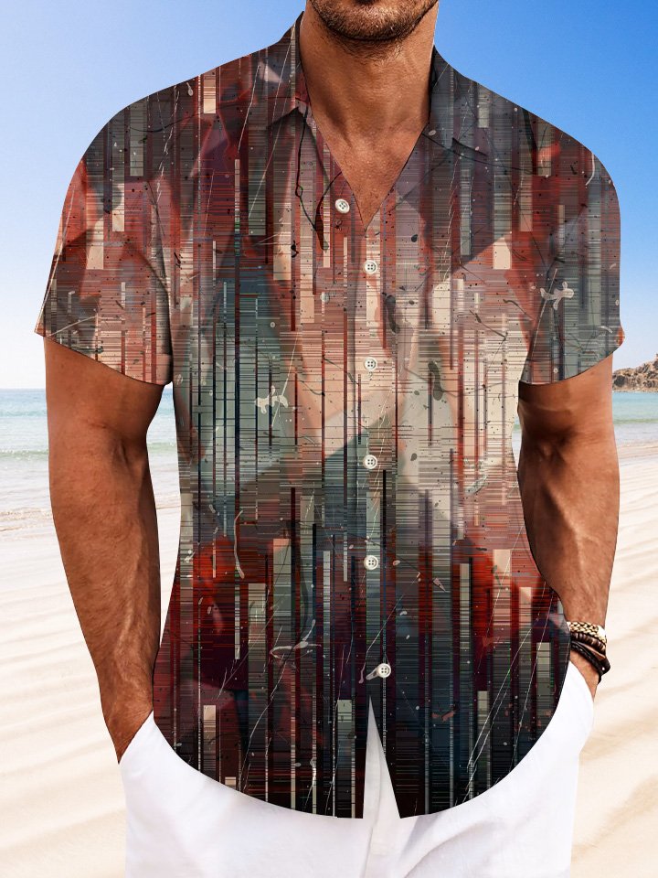 Camisa casual de manga corta con bolsillo y botones para hombre con pintura al óleo y patrón geométrico de Alohadaddy