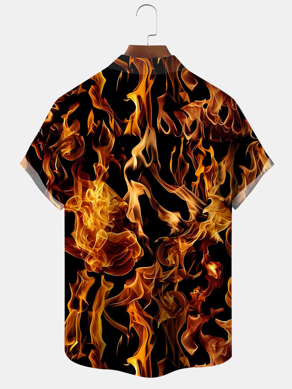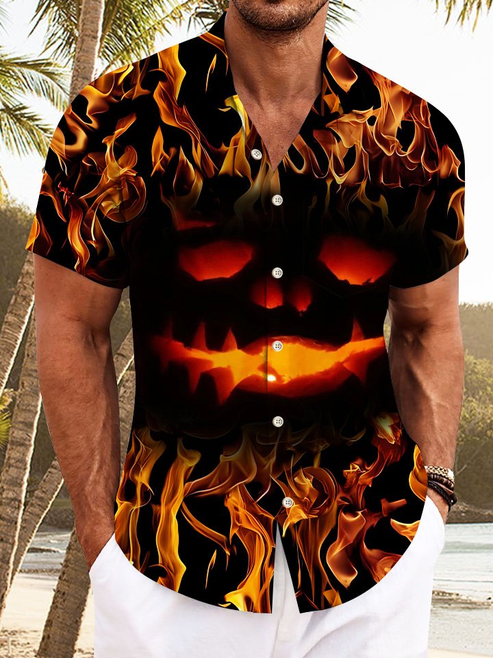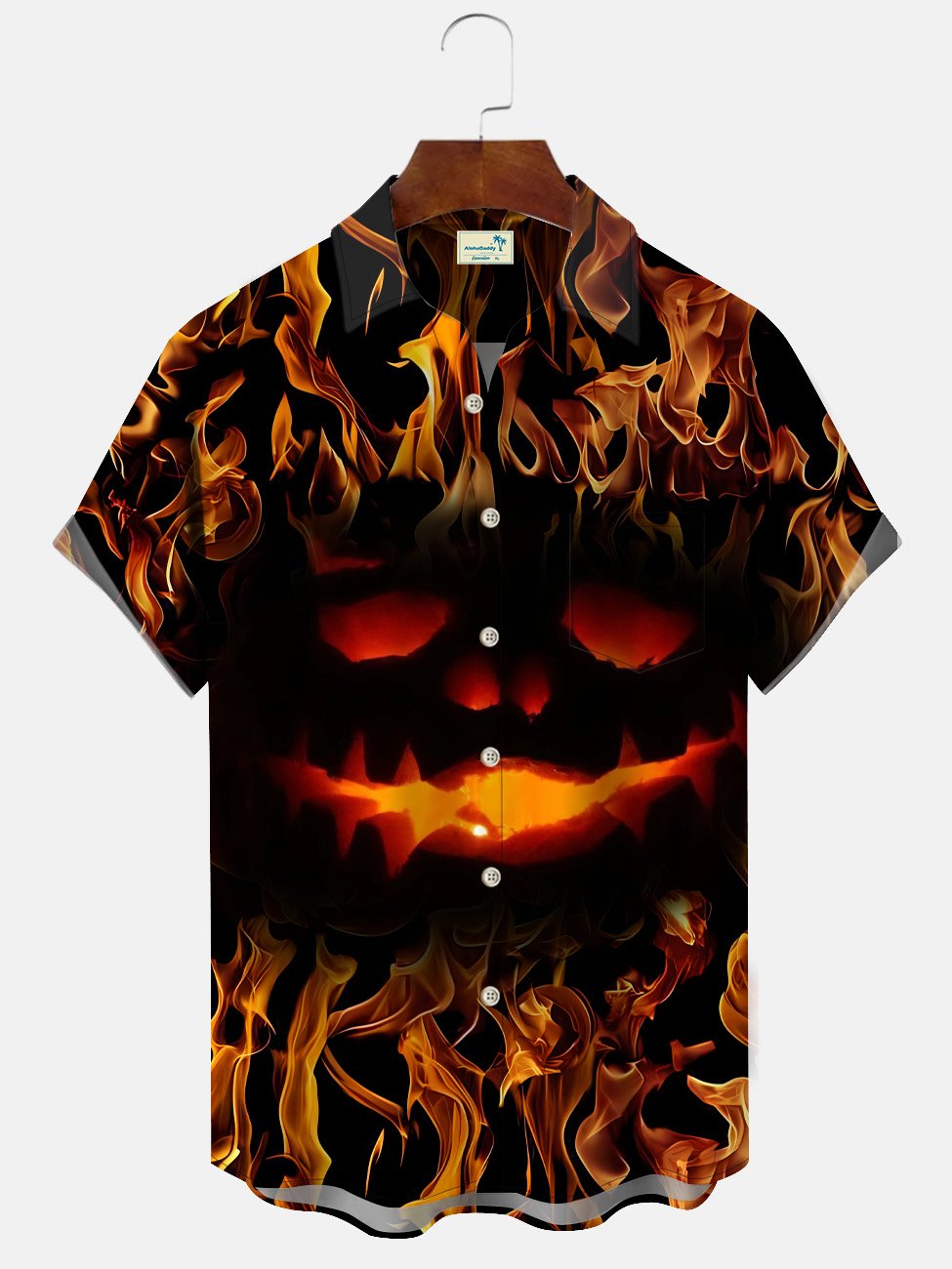 Camisa informal de manga corta con bolsillo y diseño de calabaza y llamas de Halloween para hombre de Alohadaddy
