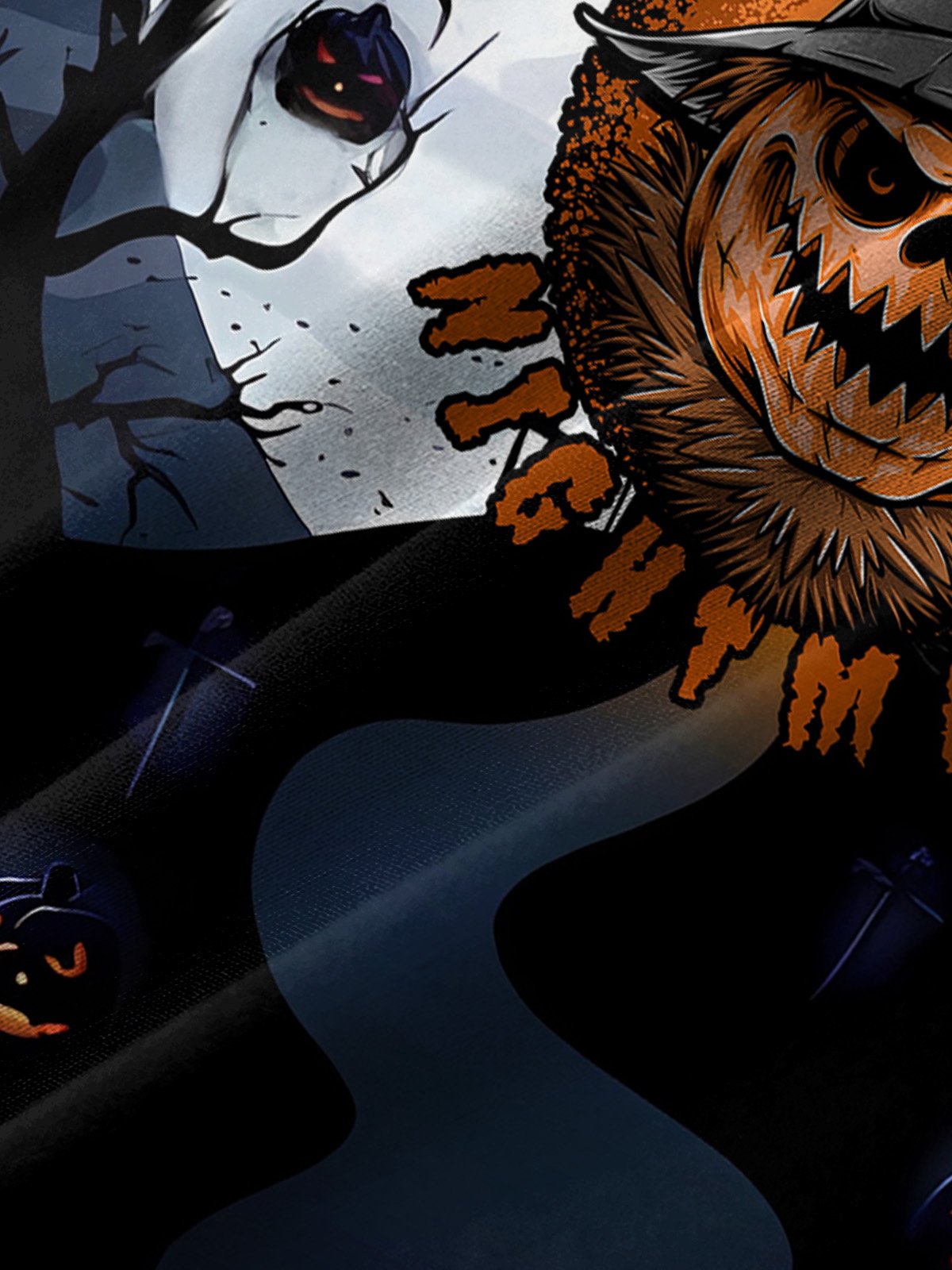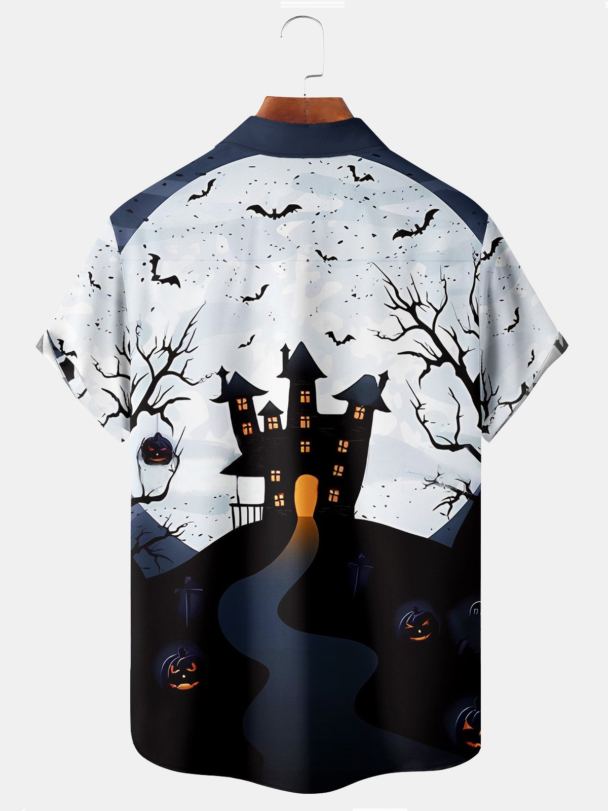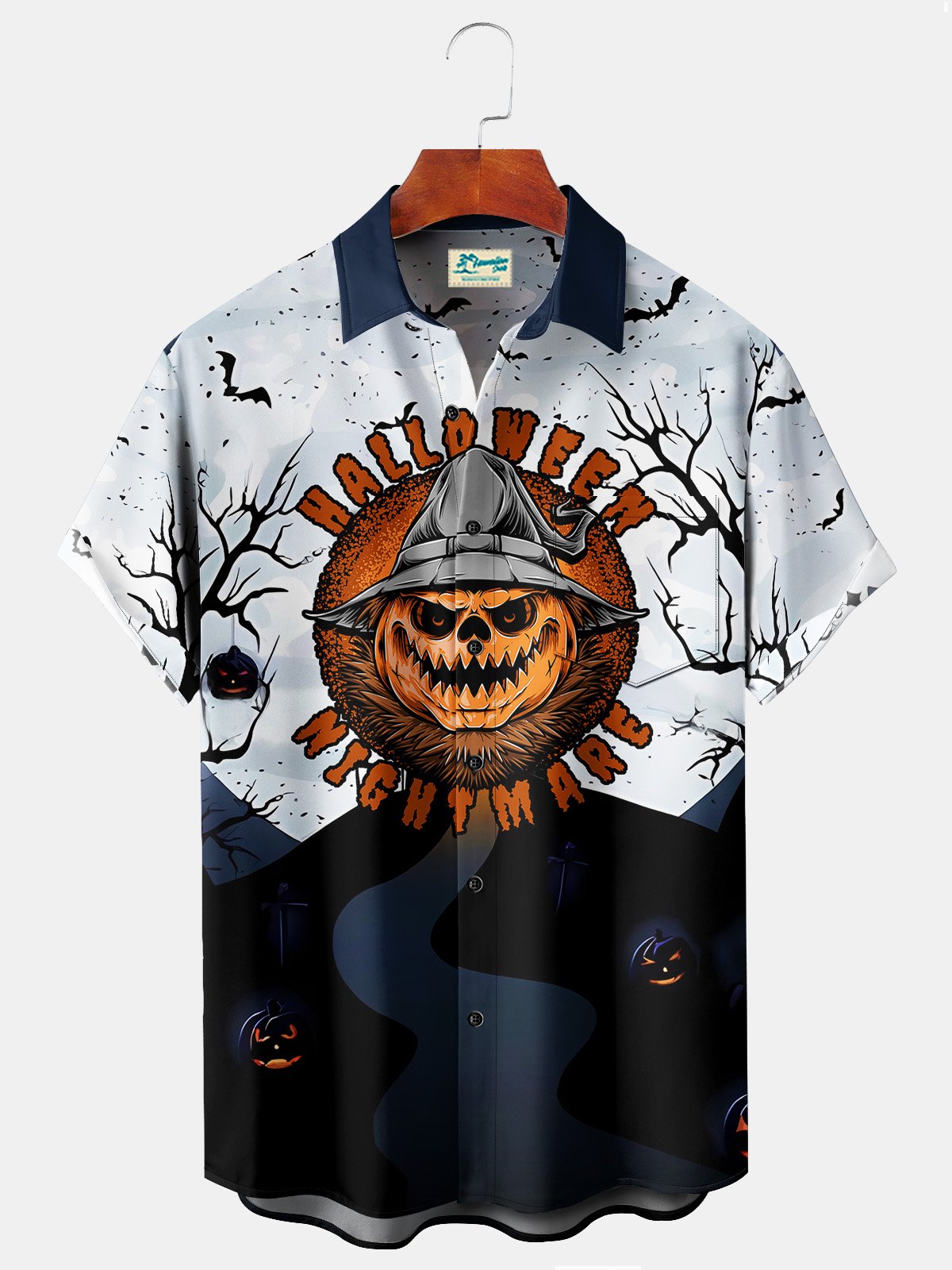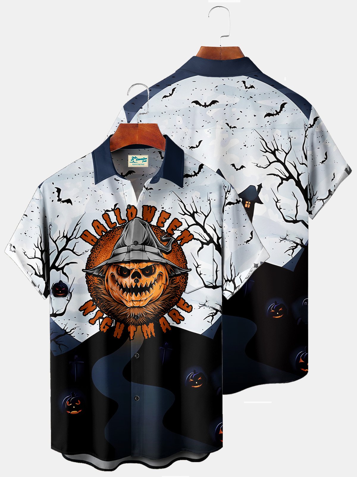 Camisas hawaianas blancas de Halloween para hombre de Alohadaddy Camisas elásticas con botones y diseño de murciélago y calabaza de talla grande para campamento Aloha