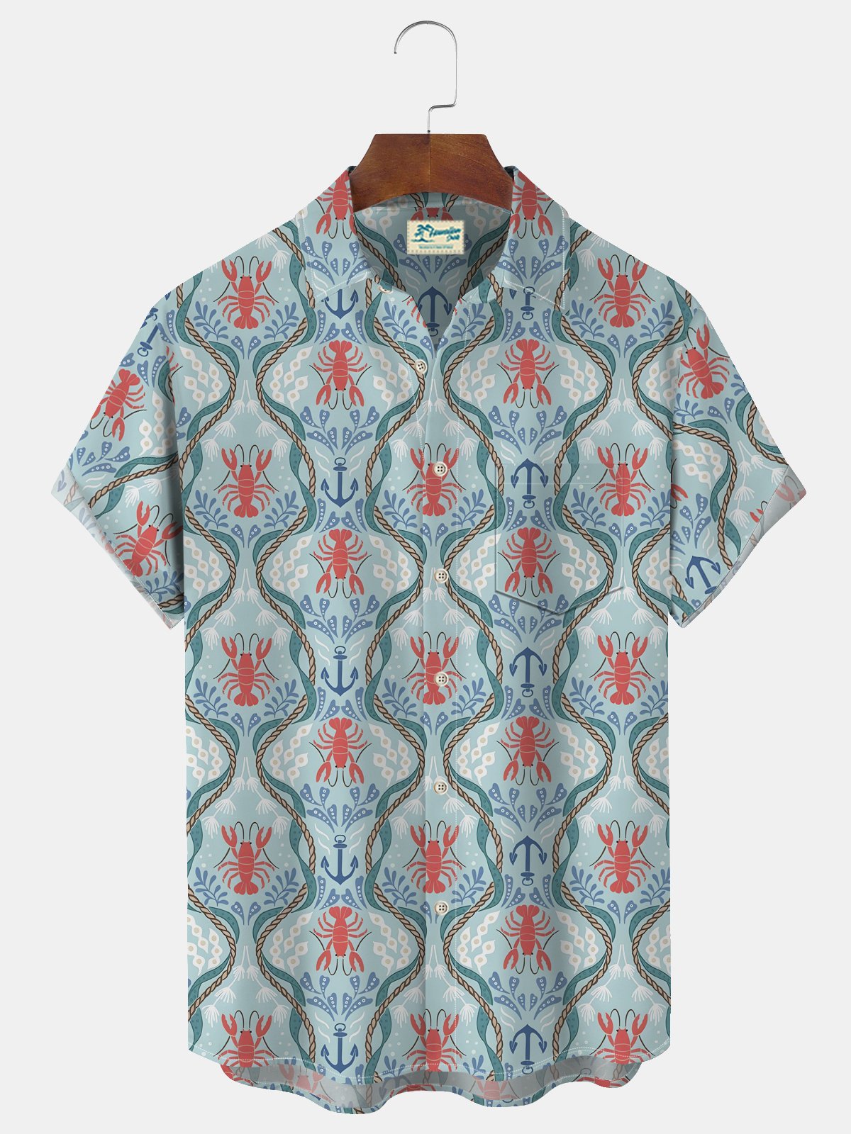Camisas hawaianas azules de playa para hombre de Alohadaddy Holiday, camisas de campamento con bolsillo, transpirables y cómodas con arte de langosta oceánica, tallas grandes
