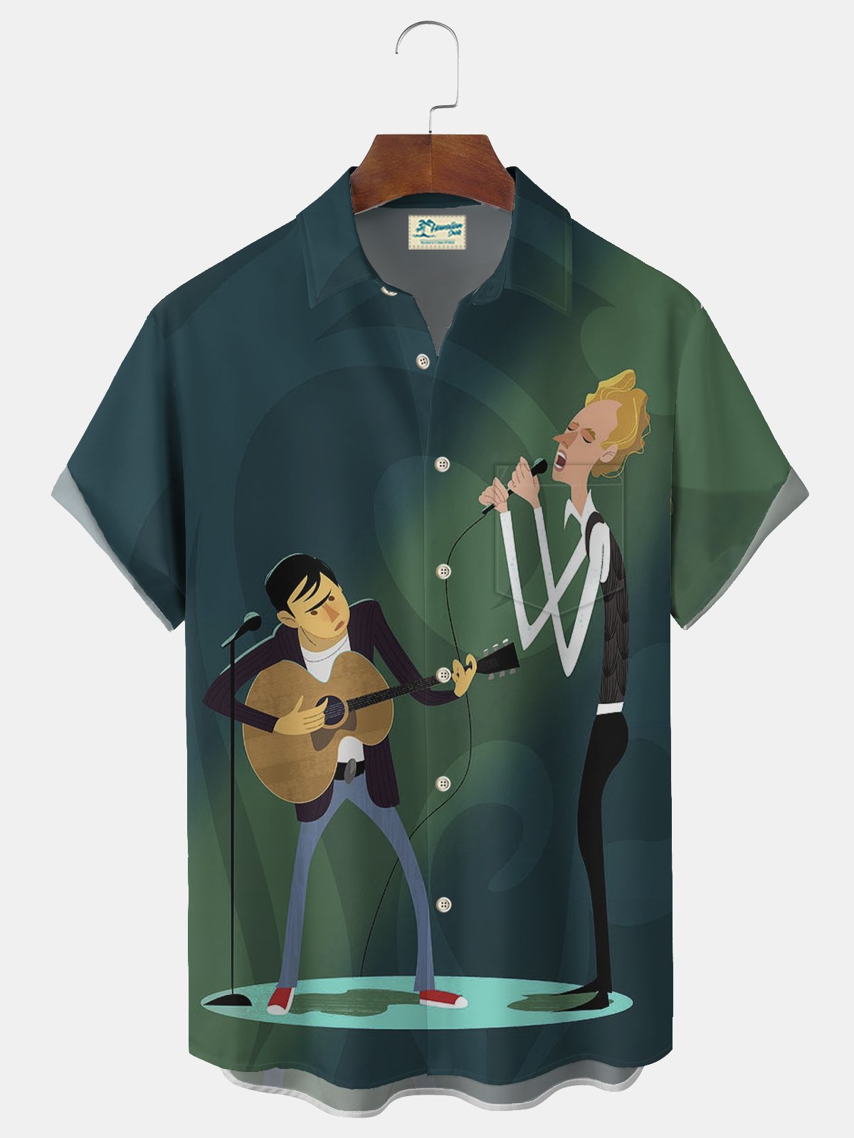 Alohadaddy® Retro Medieval Music Concert Geometric Print Men's Lapel Pocket Short Sleeve Shirt Big & Tall
