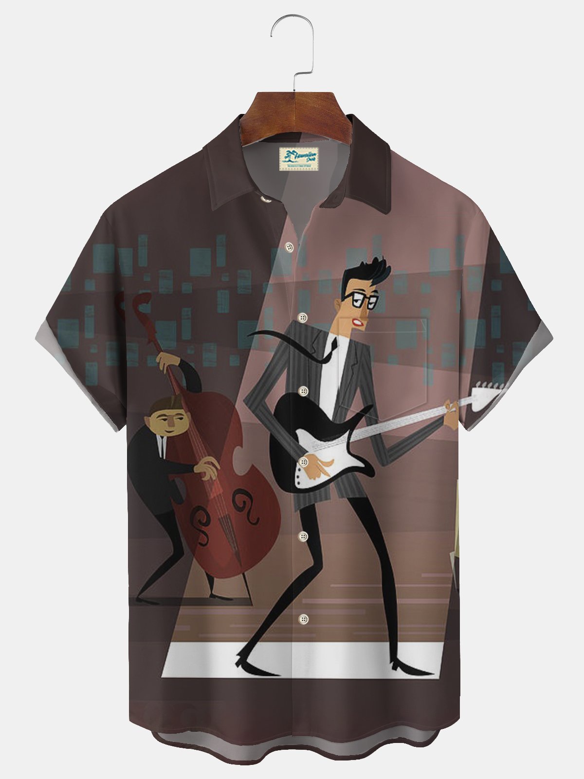 Alohadaddy® Retro Mid-Century Guitarist Geometric Print Men's Lapel Pocket Short Sleeve Shirt Big & Tall