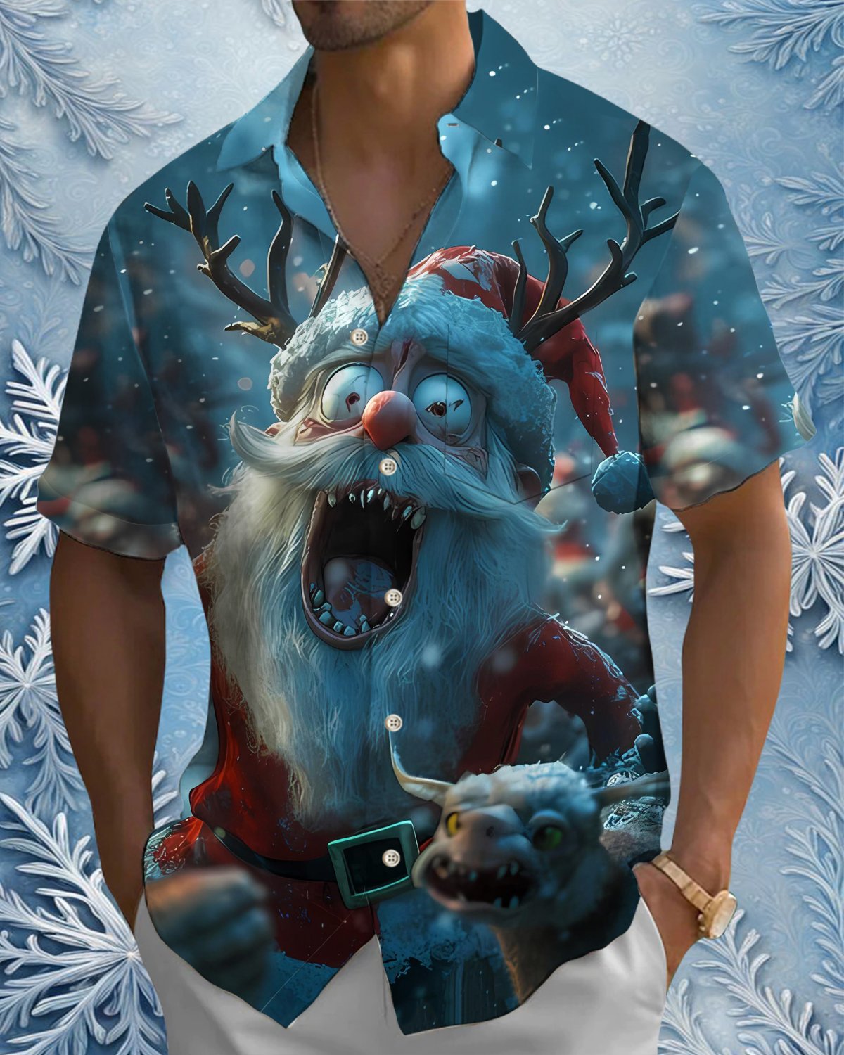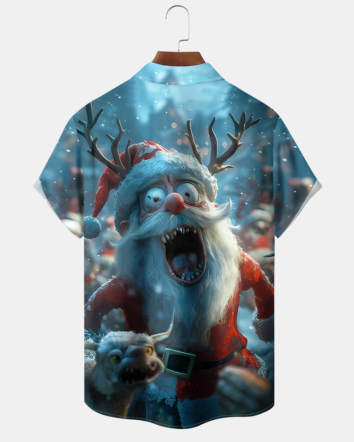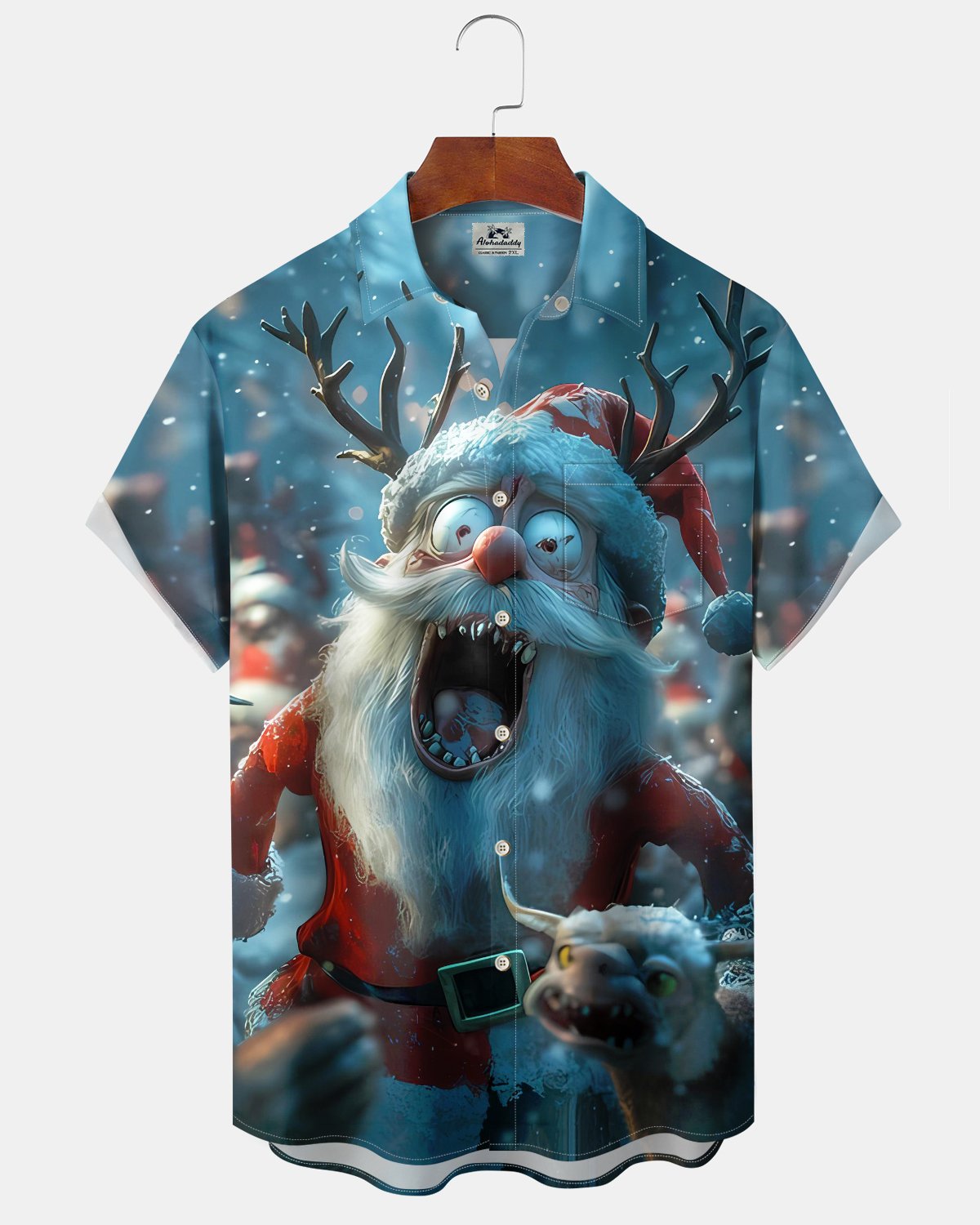 Alohadaddy® Christmas Red Eyed Santa Print Pocket Elastic Button Men's Short Sleeve Shirt Big & Tall