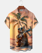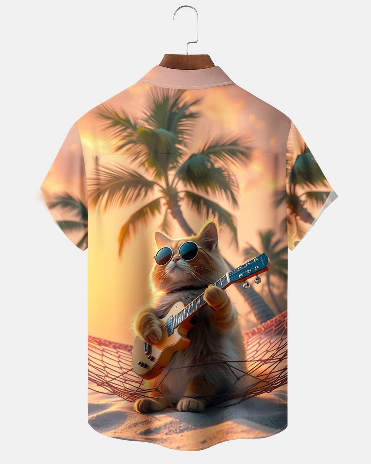 Alohadaddy® Hawaiian Beach Coconut Tree Cartoon Cat Music Guitar Men's Shirt