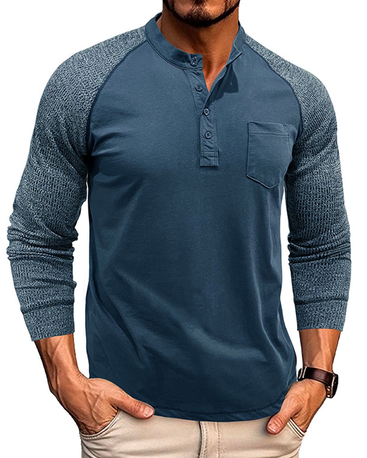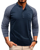Alohadaddy® Men's Round Neck Ribbed Long Sleeve Henry Bottoming Shirt American Tough Guy Contrast Retro Button T-Shirt Top