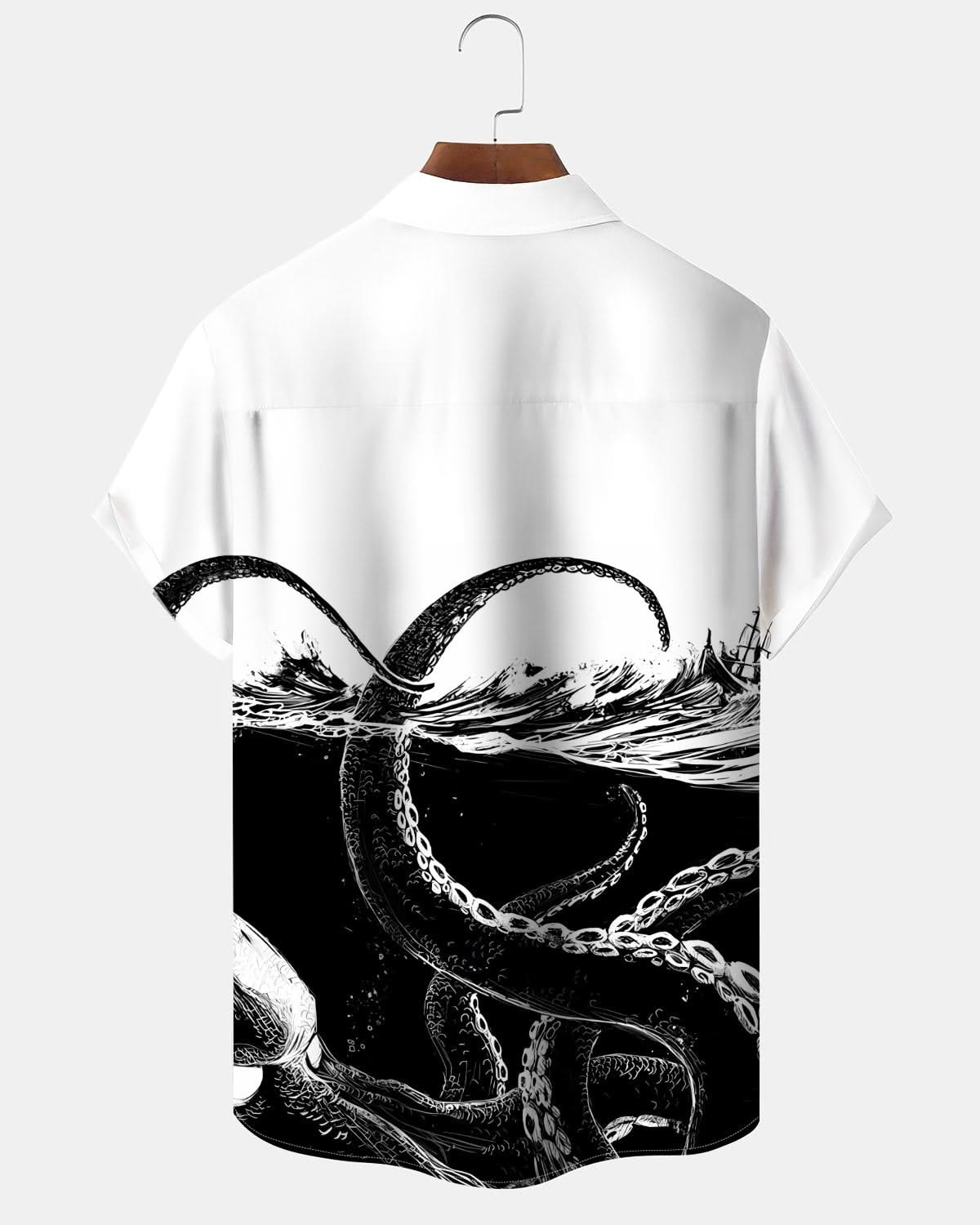 Alohadaddy® Casual Octopus Wave Art Print Pocket Elastic Button Men's Short Sleeve Shirt Big & Tall
