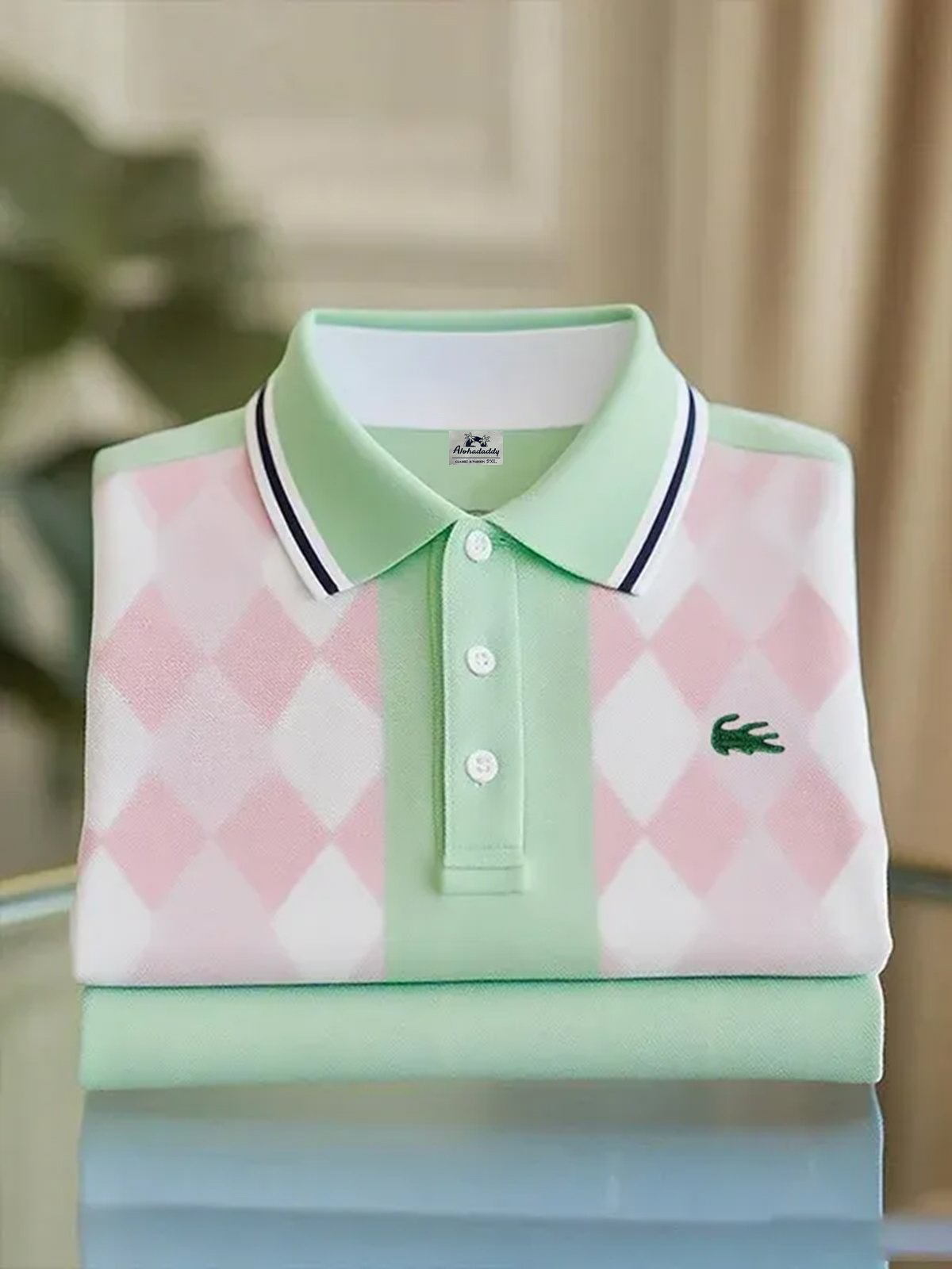 Alohadaddy® Business Casual Plaid Logo Print Glossy Elastic Button Men's Long Sleeve Polo Shirt Big & Tall
