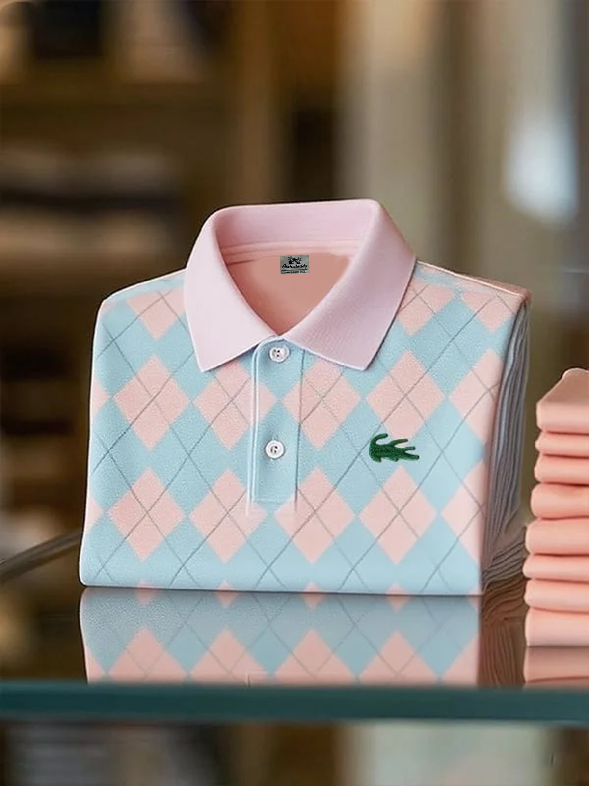 Alohadaddy® Business Plaid Geometric Print Art Elastic Button Men's Short Sleeve Polo Big & Tall
