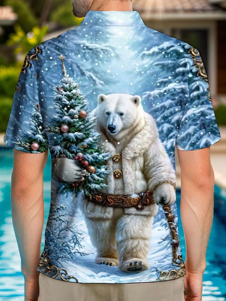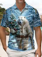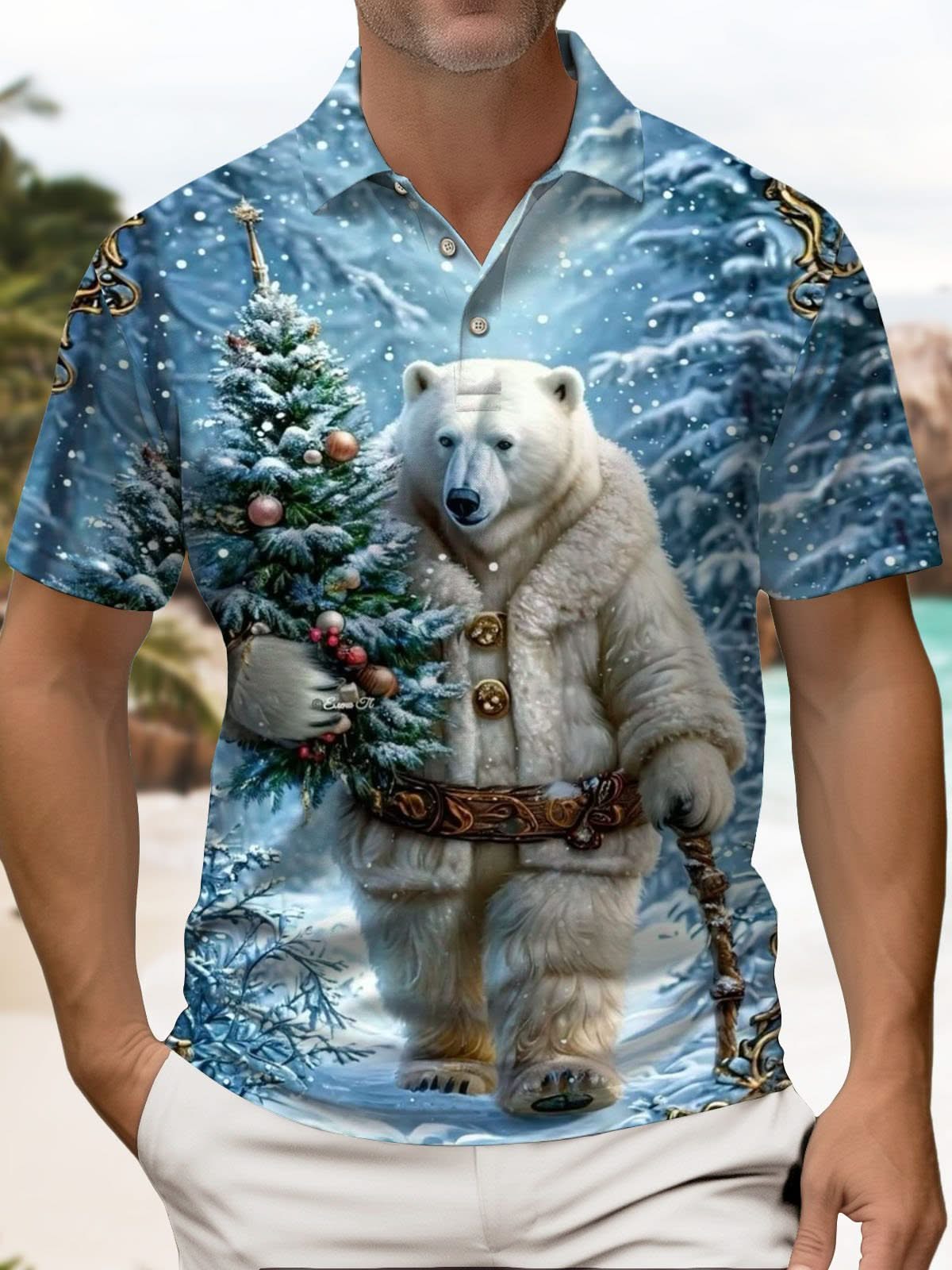 Alohadaddy® Christmas White Bear Print Elastic Button Men's Short Sleeve Polo Shirt Big & Tall