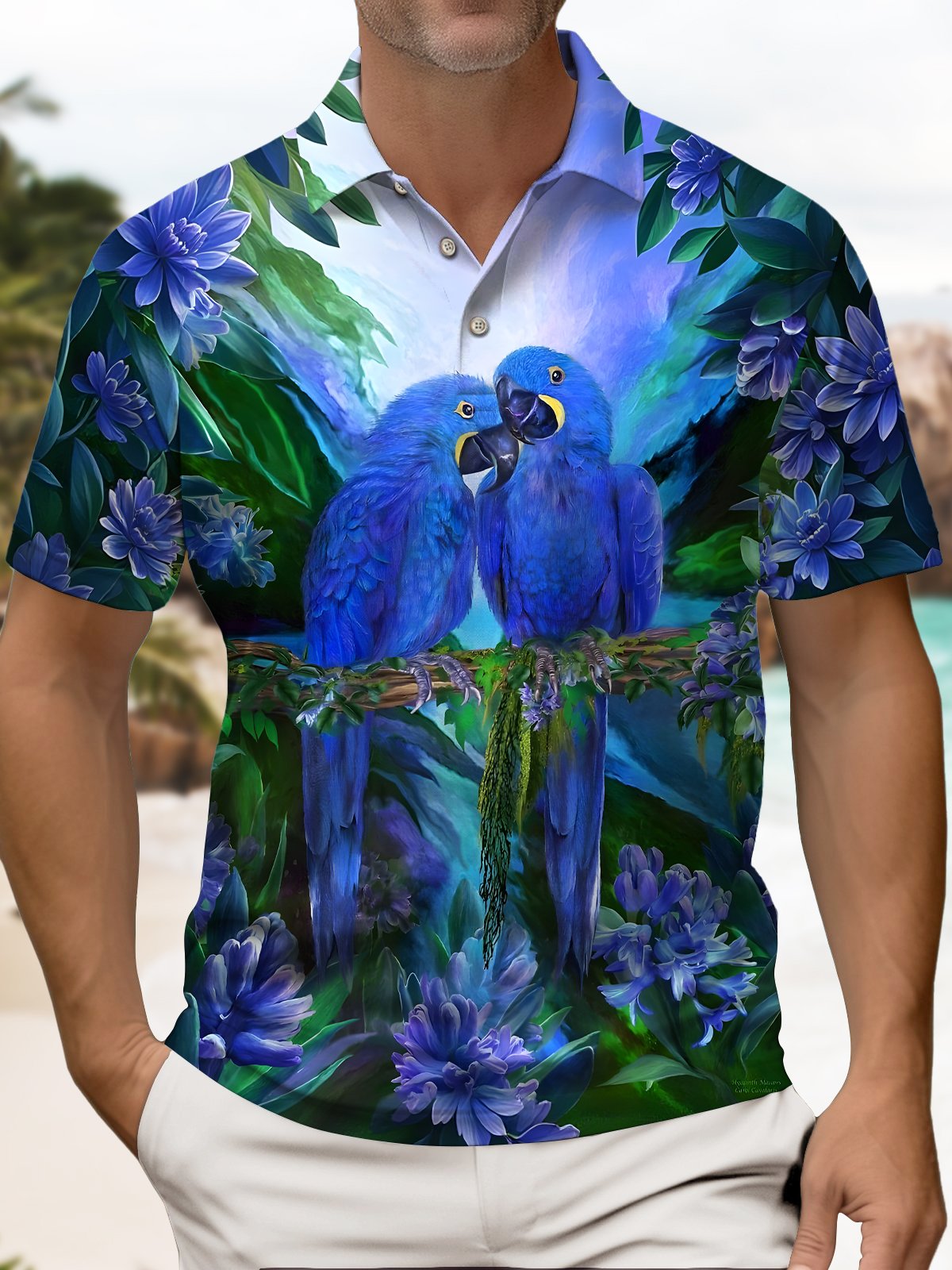 Alohadaddy® Hawaiian Tropical Flower Parrot Short-Sleeve Polo Shirt