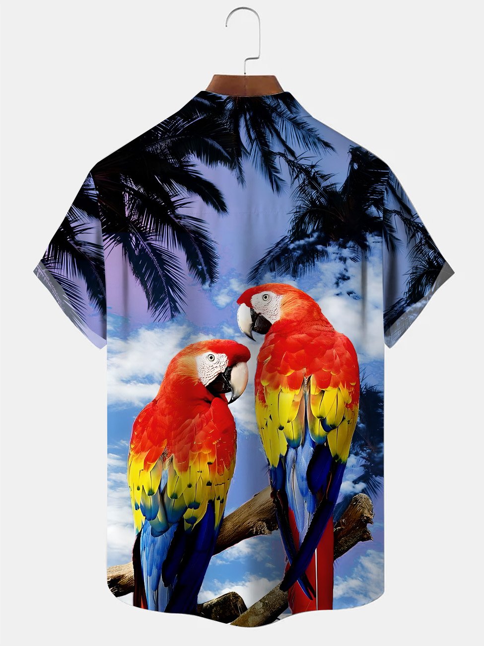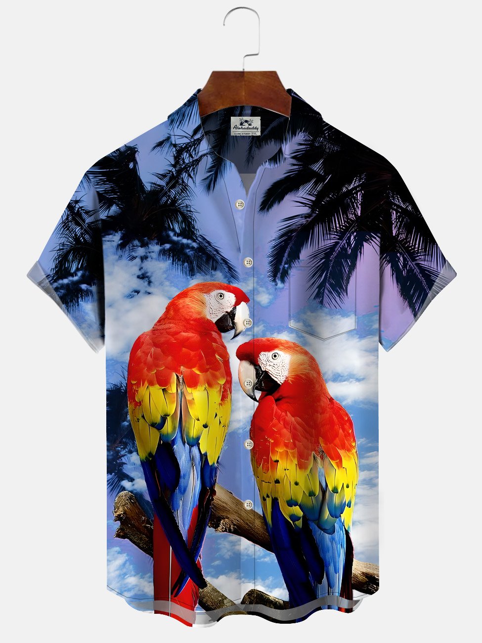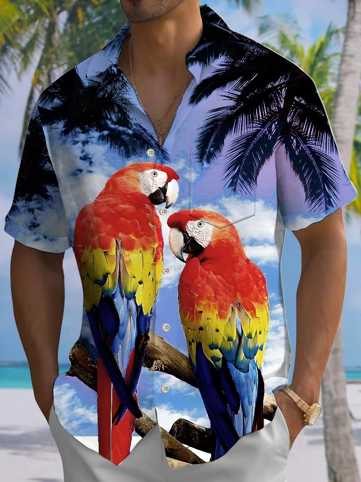 Camisa de ocio y vacaciones con bolsillo abotonado y diseño de loro y árbol de coco de Alohadaddy