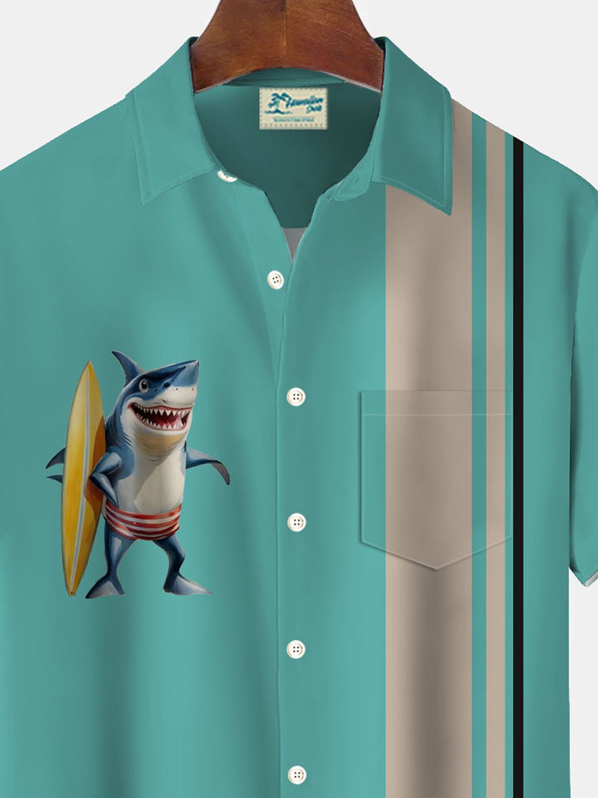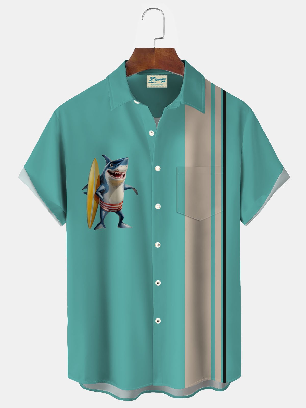 Camisa de manga corta con bolsillo abotonado y estampado digital 3D de tiburón bolos retro de Alohadaddy para hombre, talla grande y alta