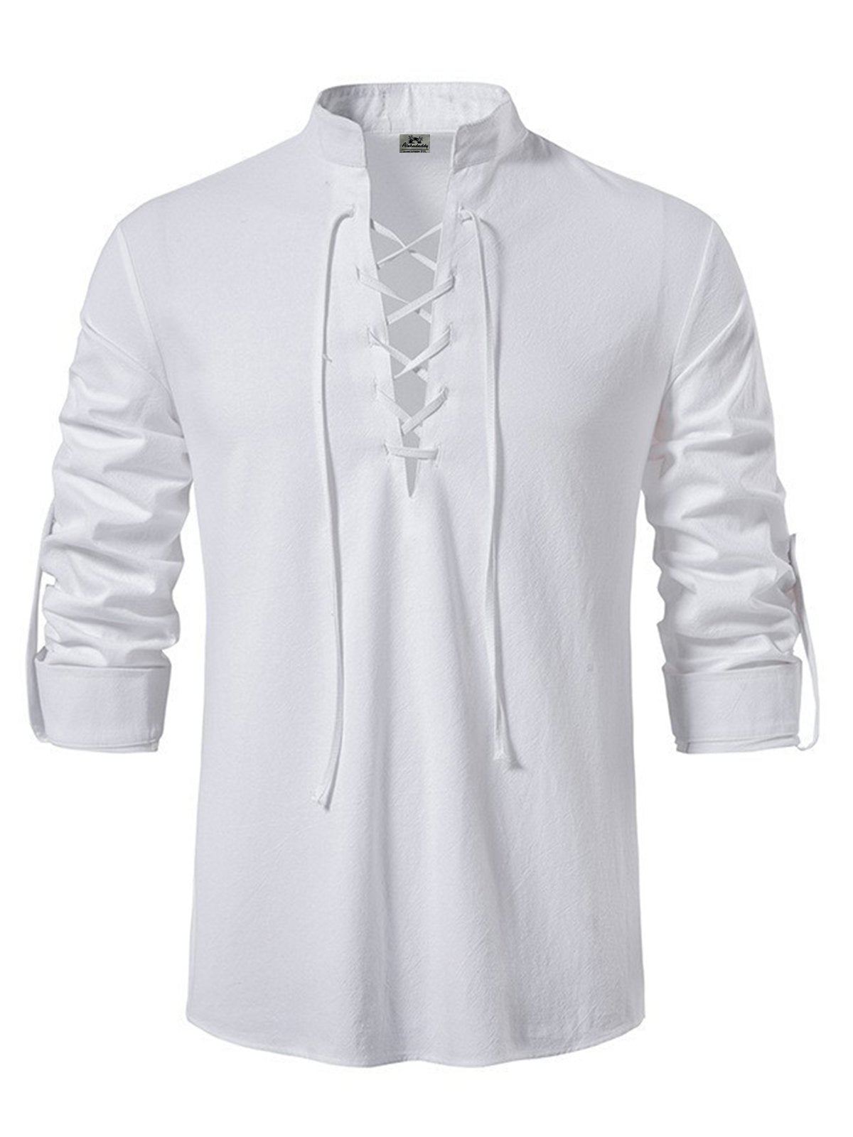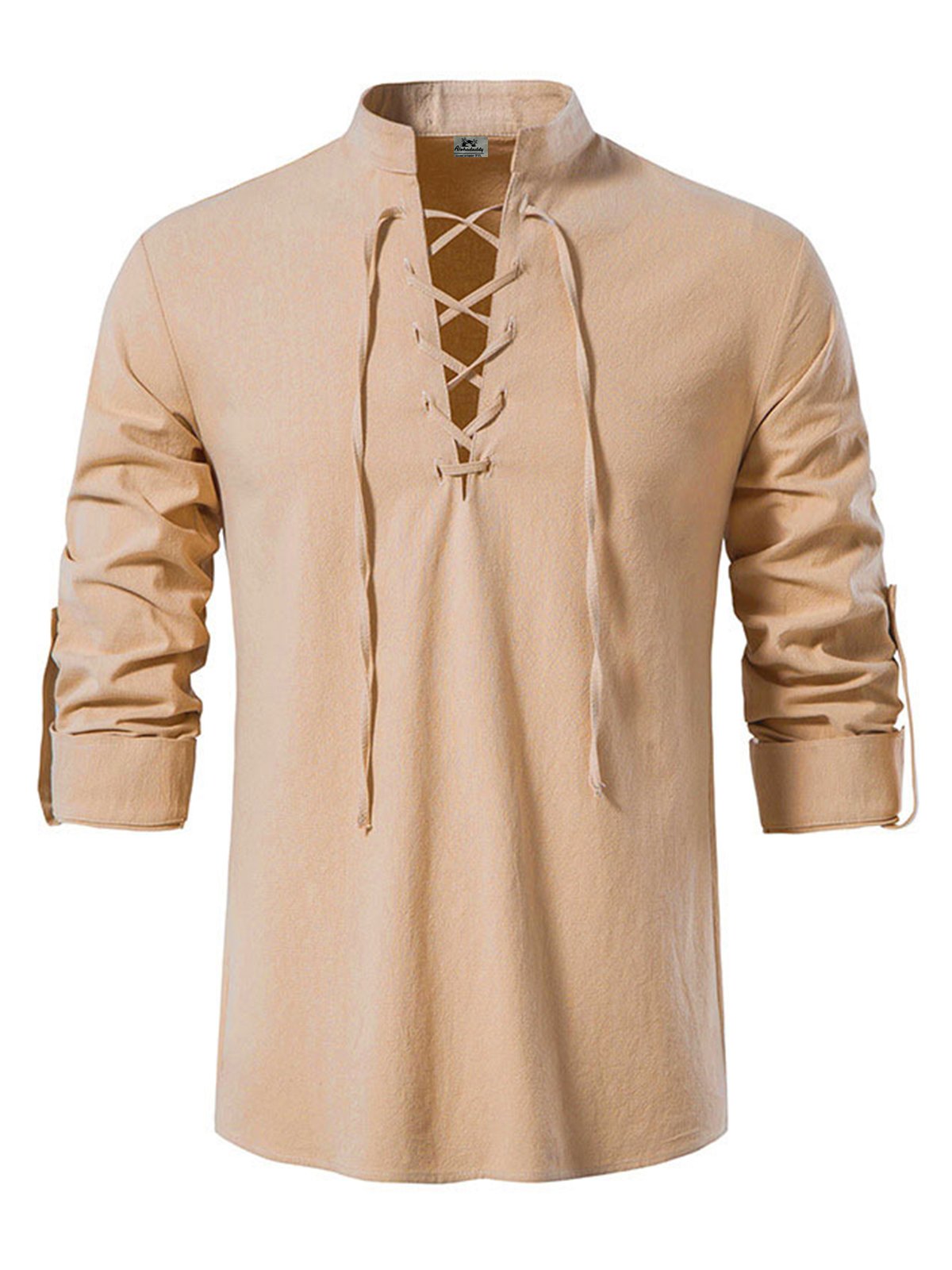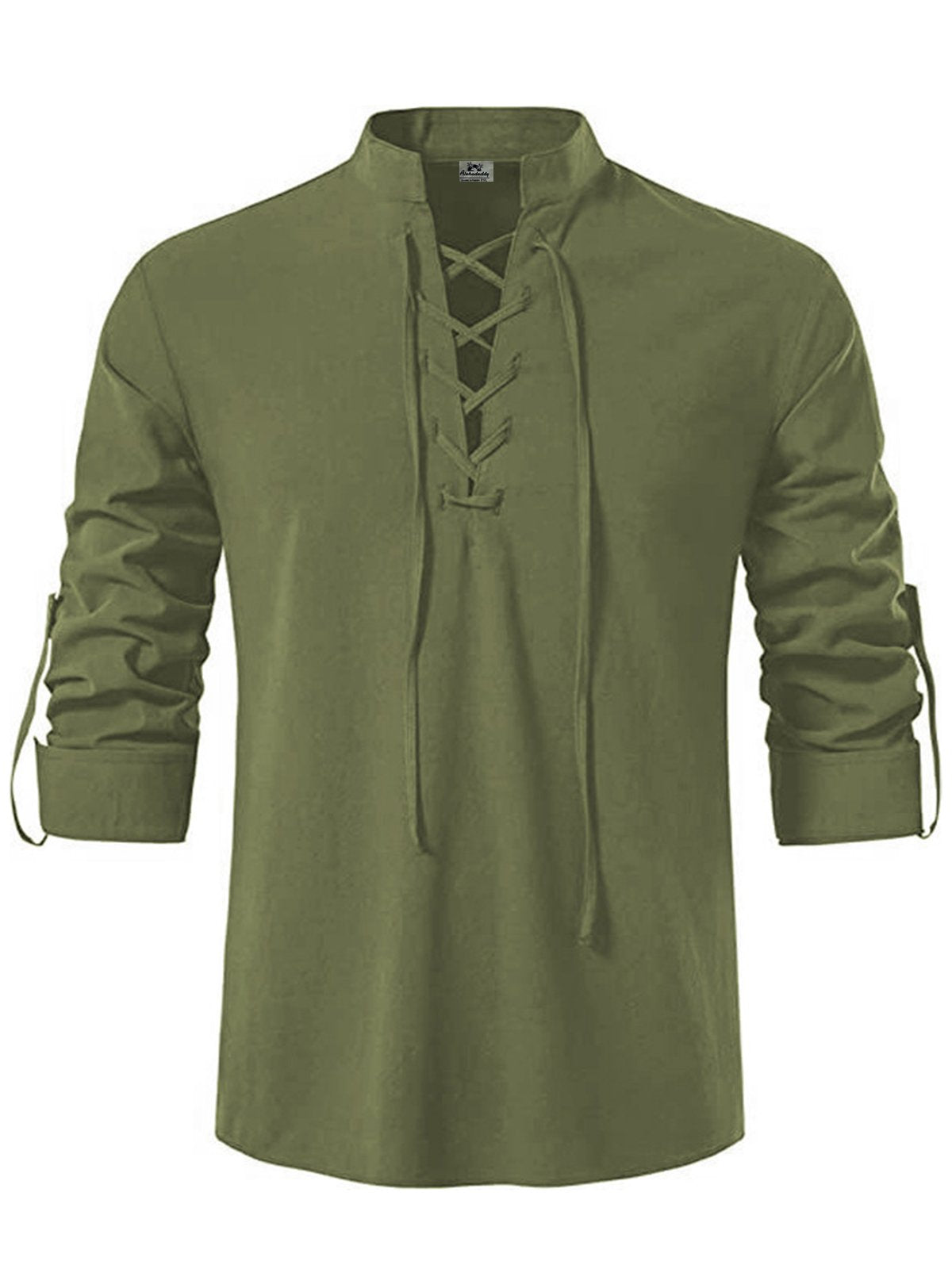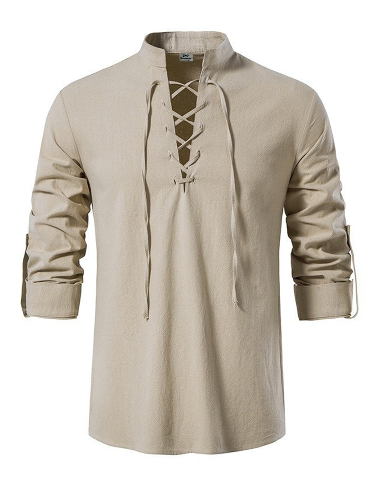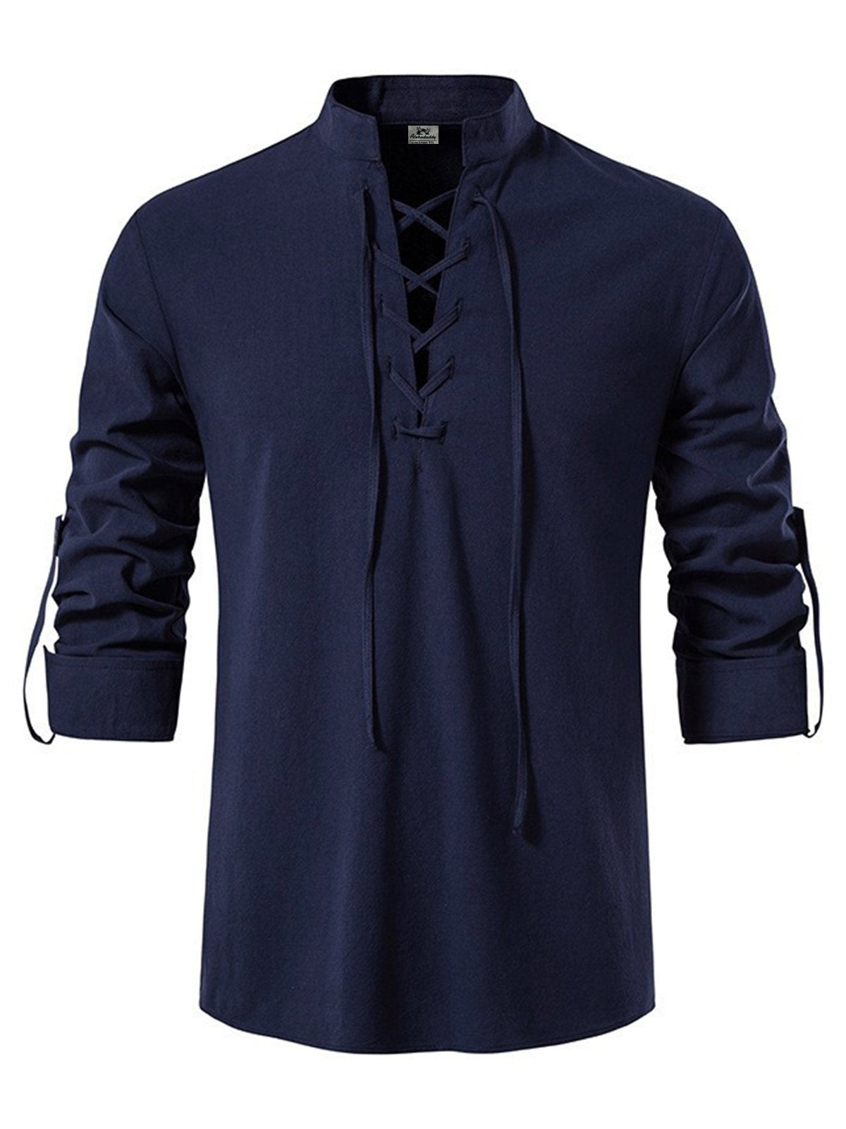 Alohadaddy® Men's Cotton Henley Long Sleeve Casual Beach Shirt Stand Collar European and American Drawstring Shirt
