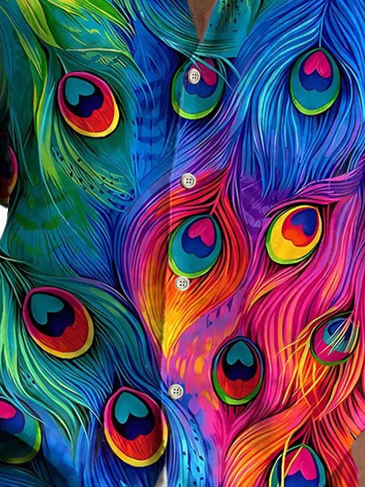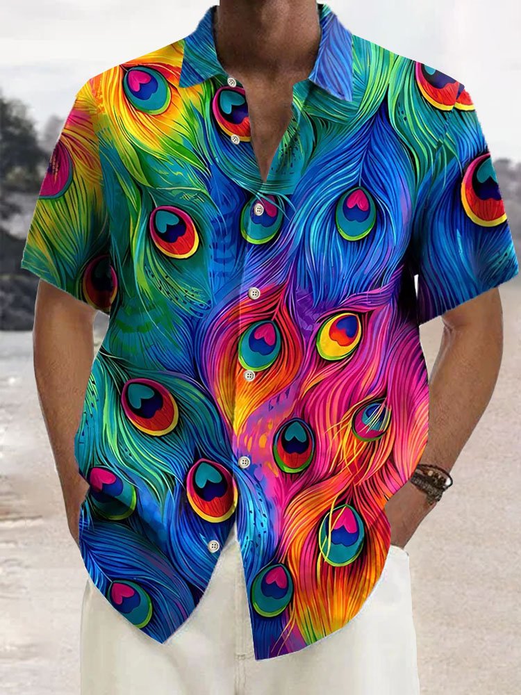 Camisa de manga corta con bolsillo abotonado para hombre con estampado de plumas de pavo real hawaiano Alohadaddy