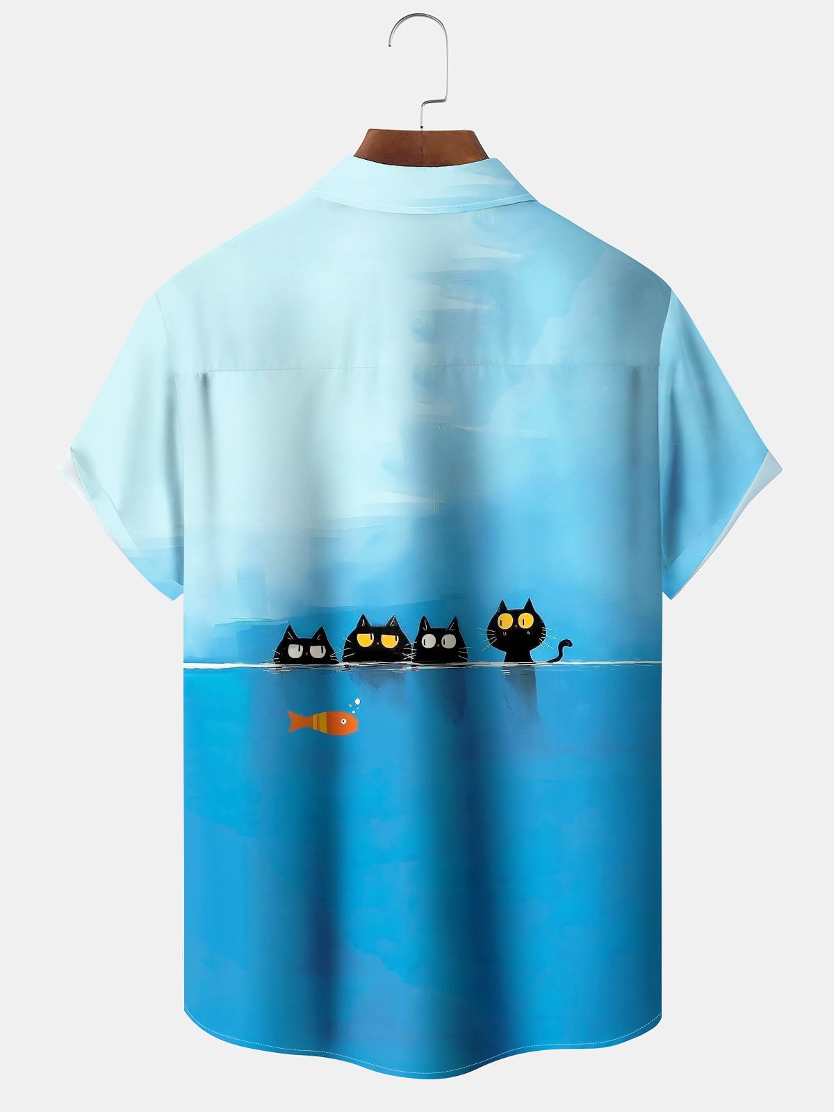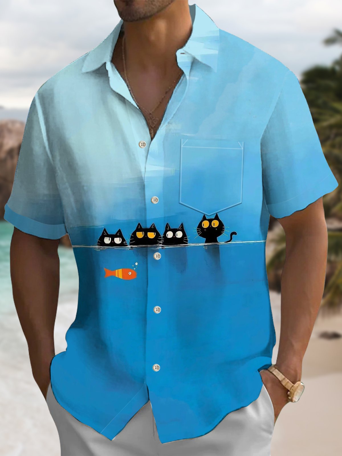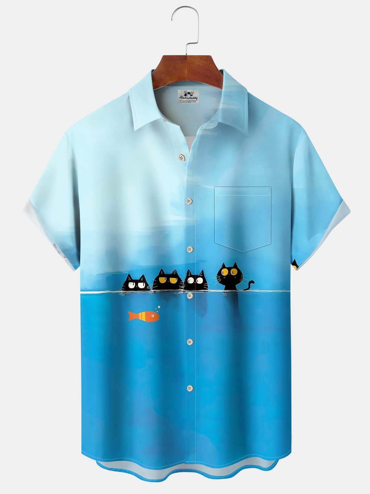 Alohadaddy® Hawaiian Ocean Fun Cat Print Men's Short Sleeve Shirt with Elastic Pockets and Buttons