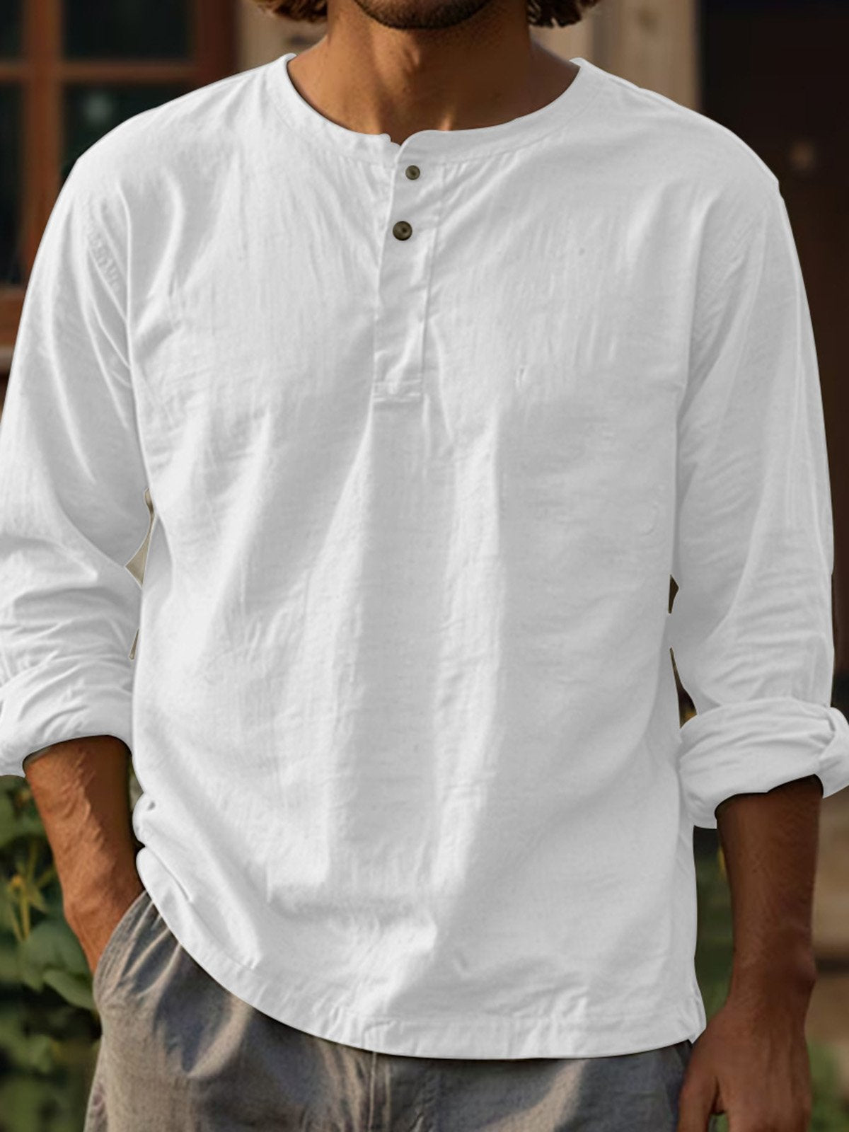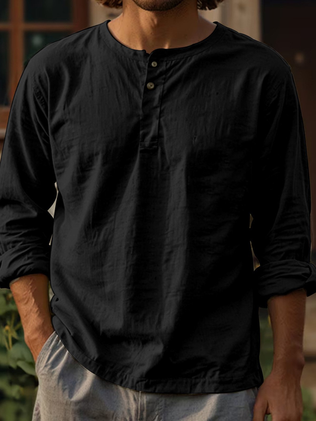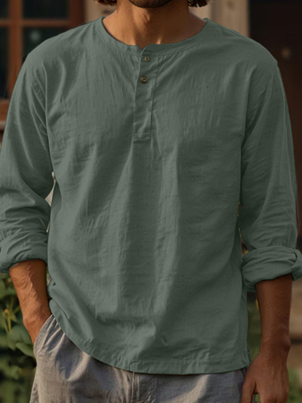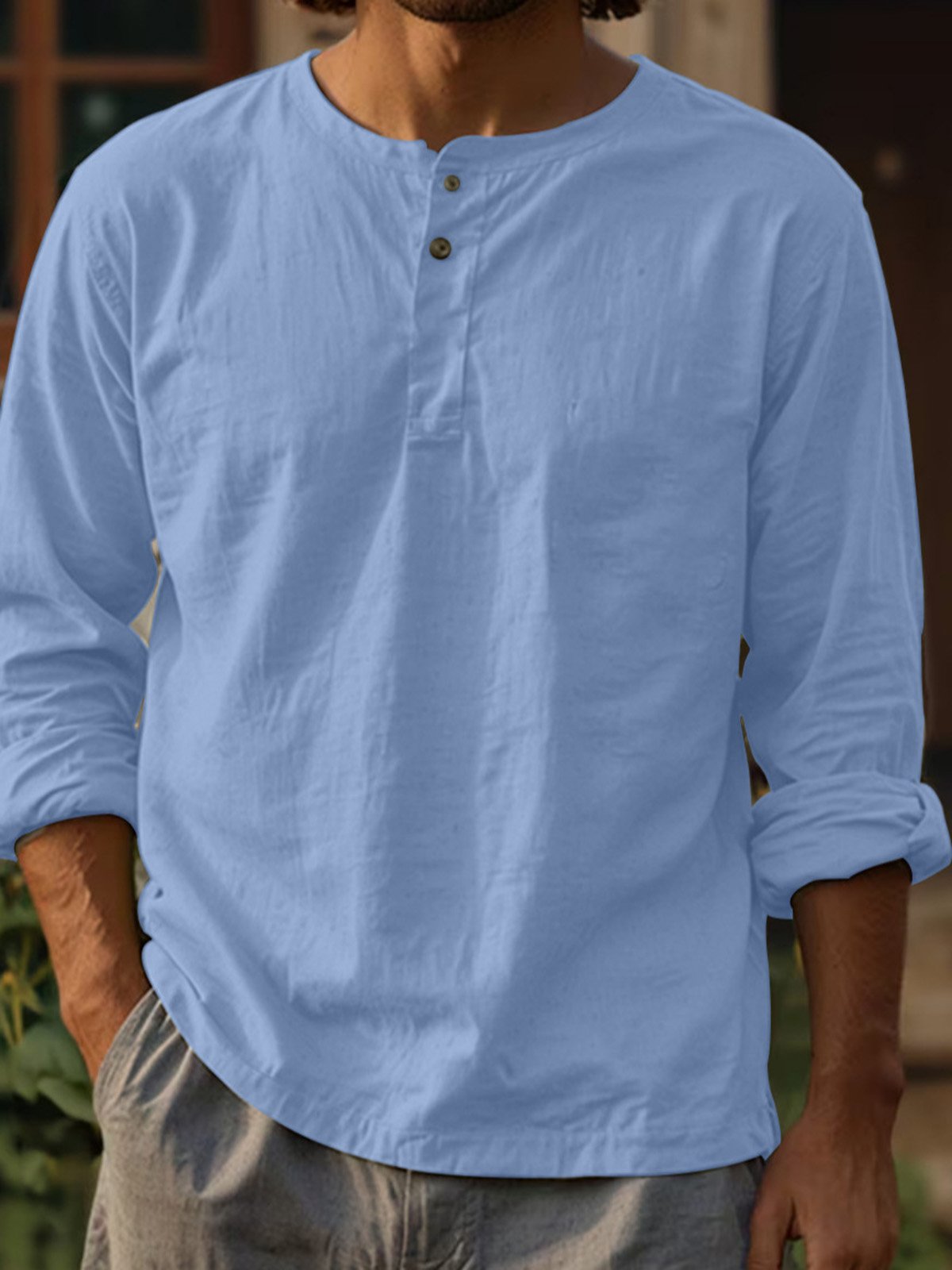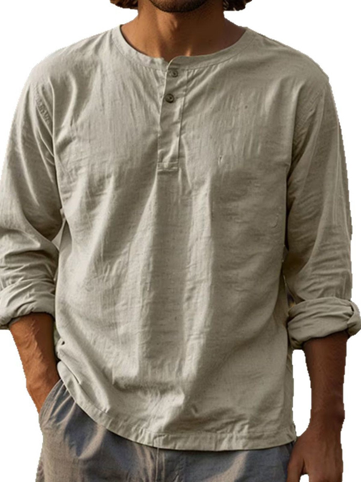 Alohadaddy® Casual Long Sleeve Cotton and Linen Solid Color Shirt Round Neck Clothing Button Two-Button Linen T-Shirt Big & Tall