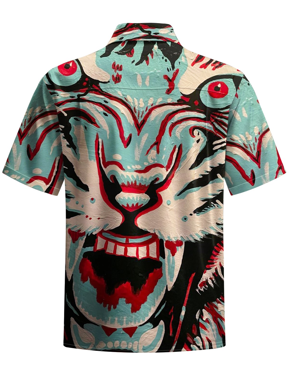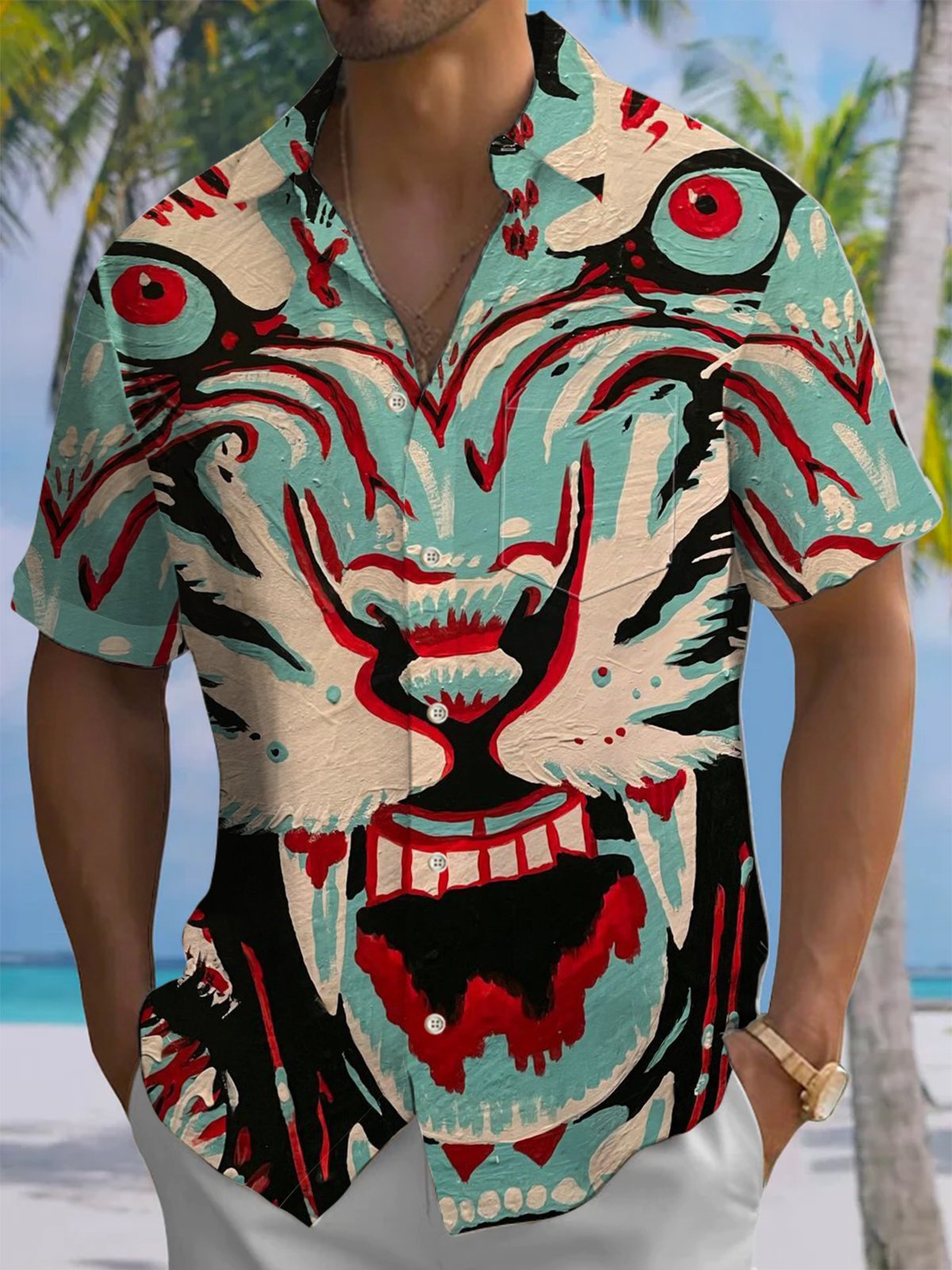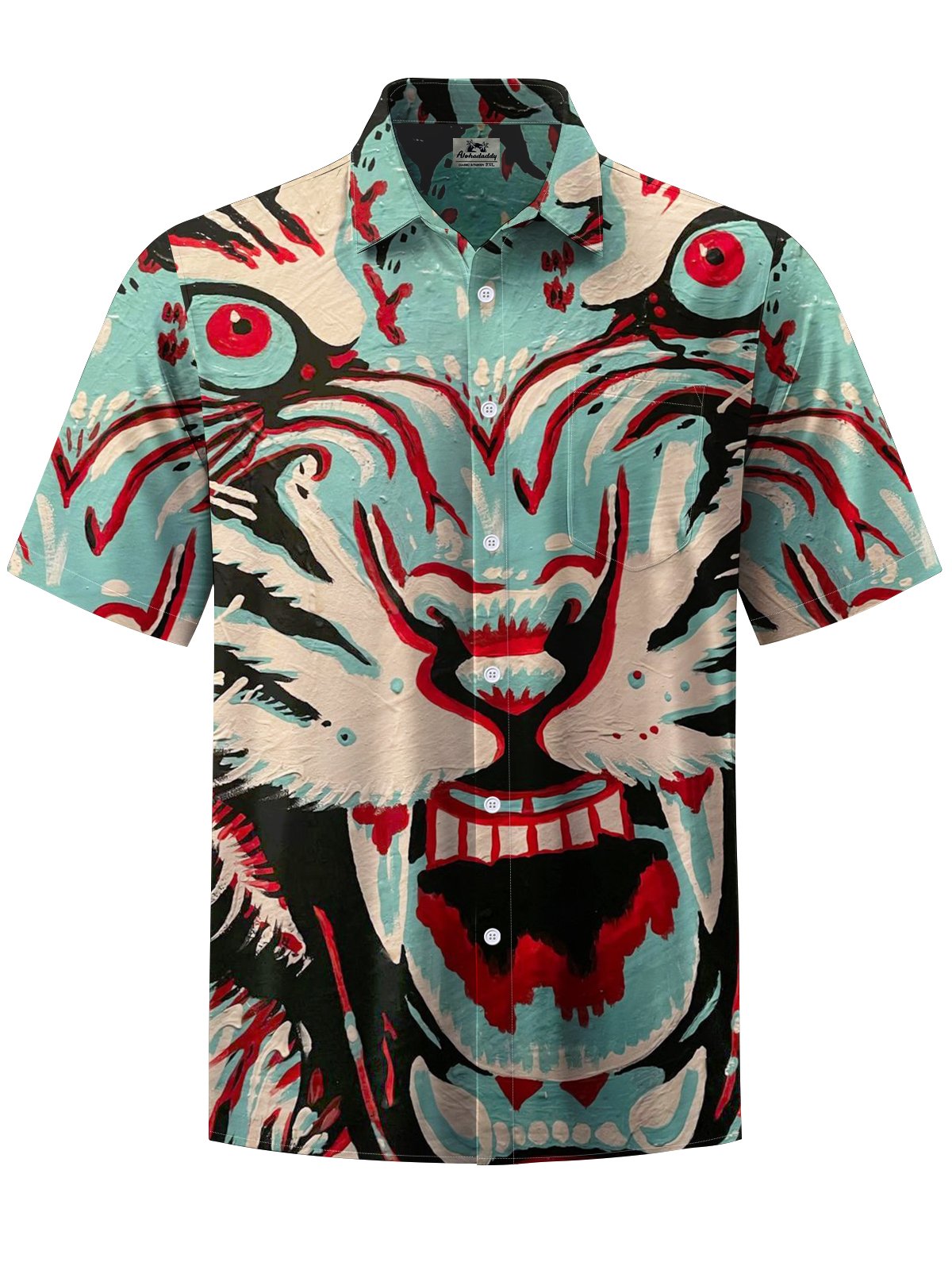Alohadaddy® Vintage Oil Painting Tiger Head Print Art Chest Pocket Men's Short Sleeve Shirt Big & Tall