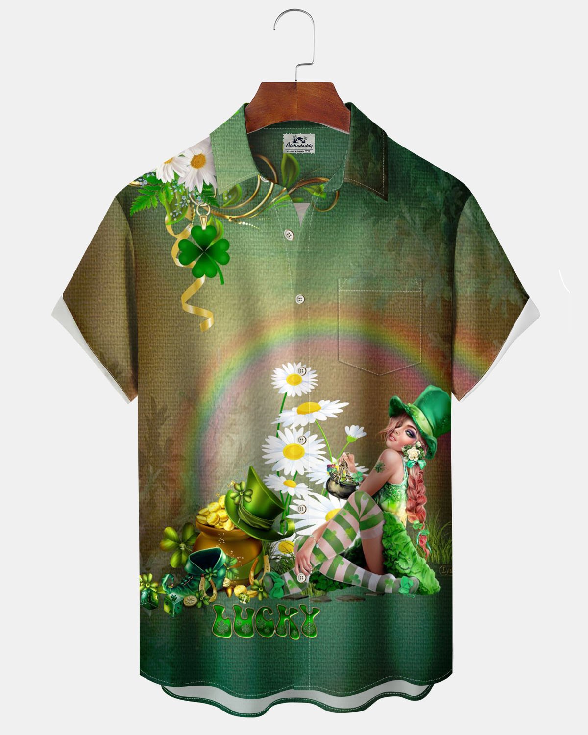 Alohadaddy® Holiday St. Patrick's Day Four-Leaf Clover Print Art Button-Down Cardigan Pocket Men's Short-Sleeve Shirt