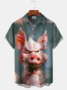 Alohadaddy Hawaiian Casual Oil Painting Angry Pig Painting Art Button Cardigan Pocket Large Size Long Polyester Short Sleeve Shirt