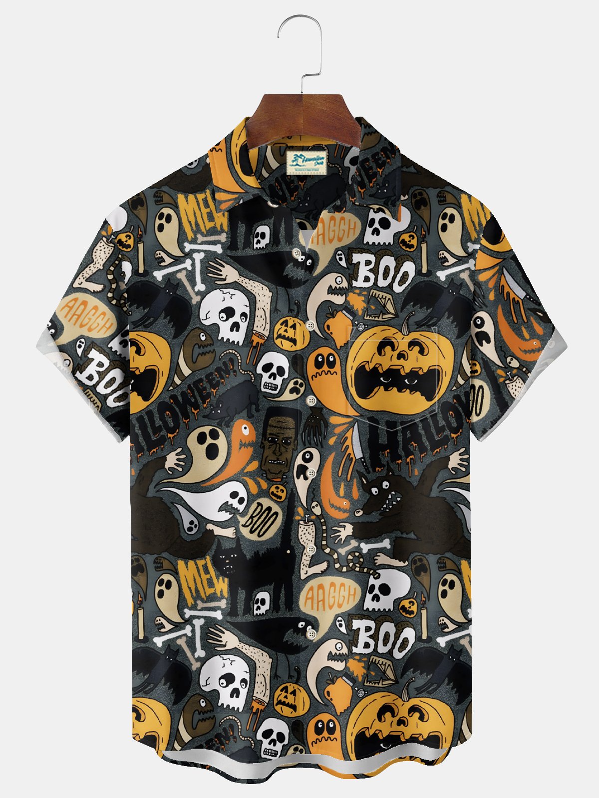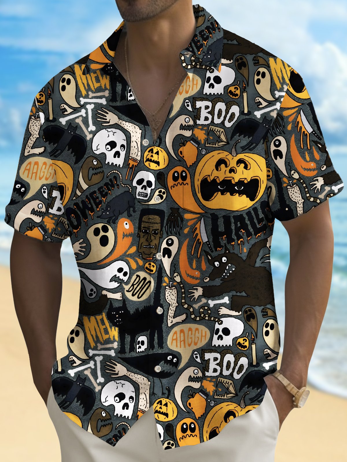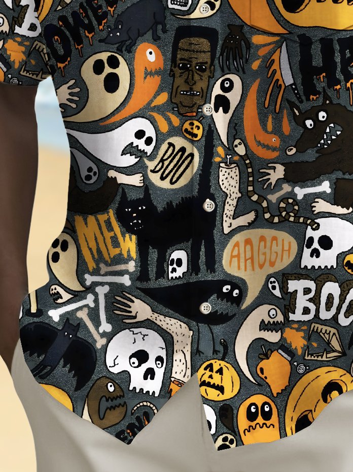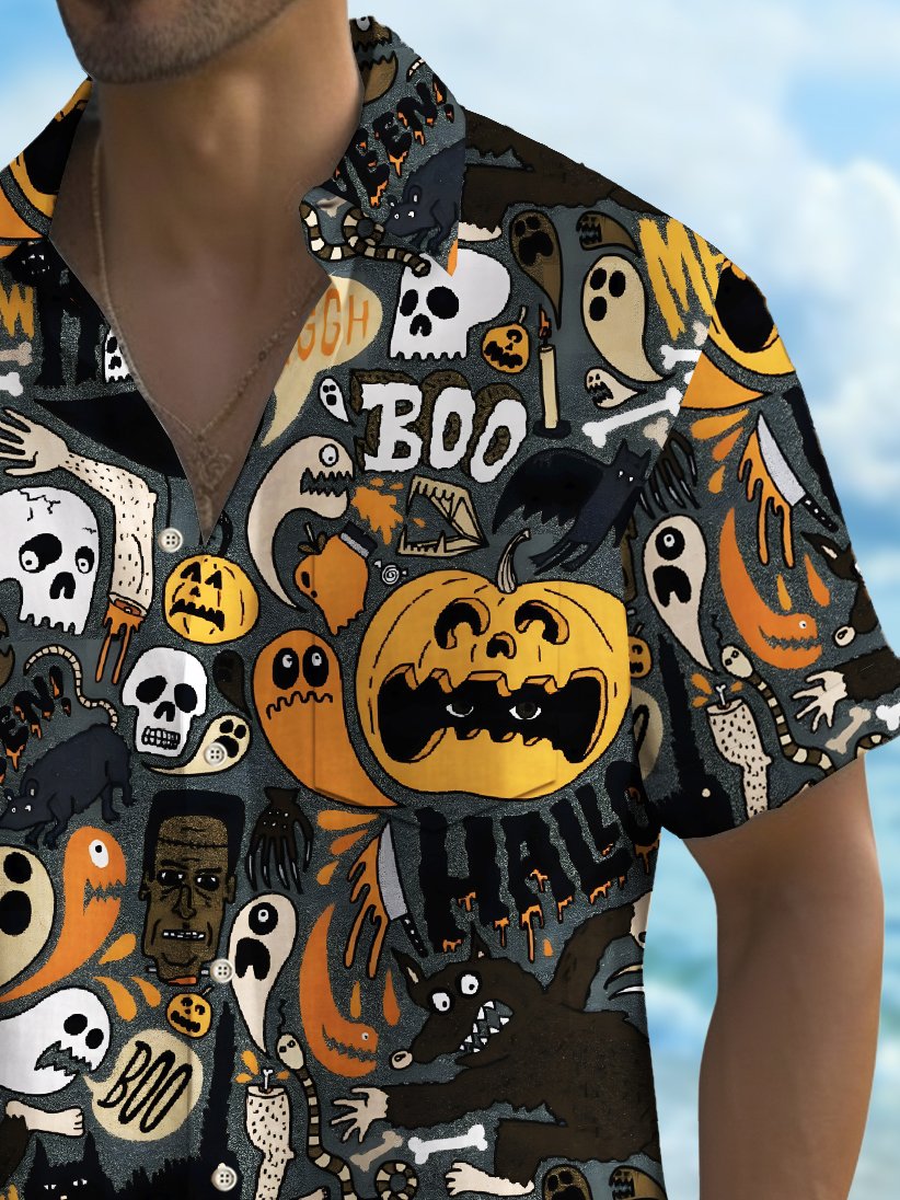Chemise extensible à poche poitrine pour homme avec imprimé dessin animé de crâne et citrouille d'Halloween Alohadaddy