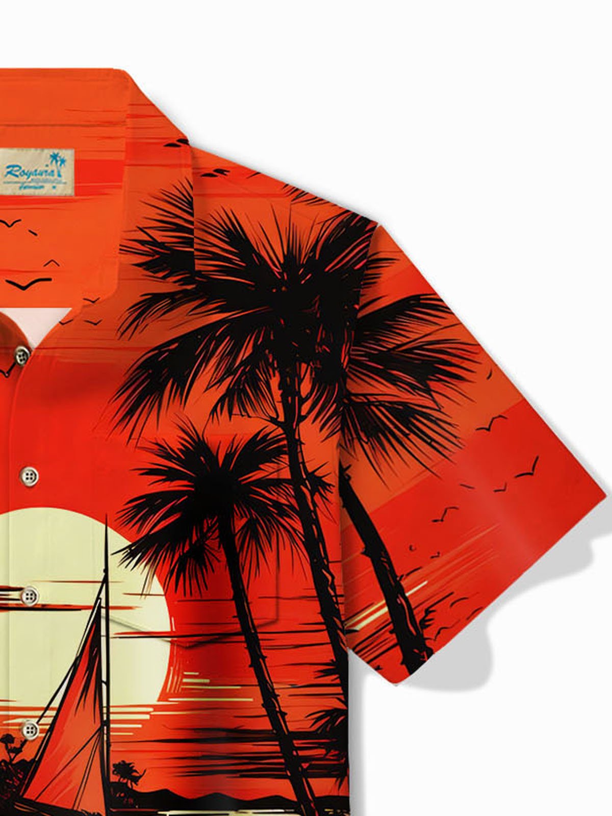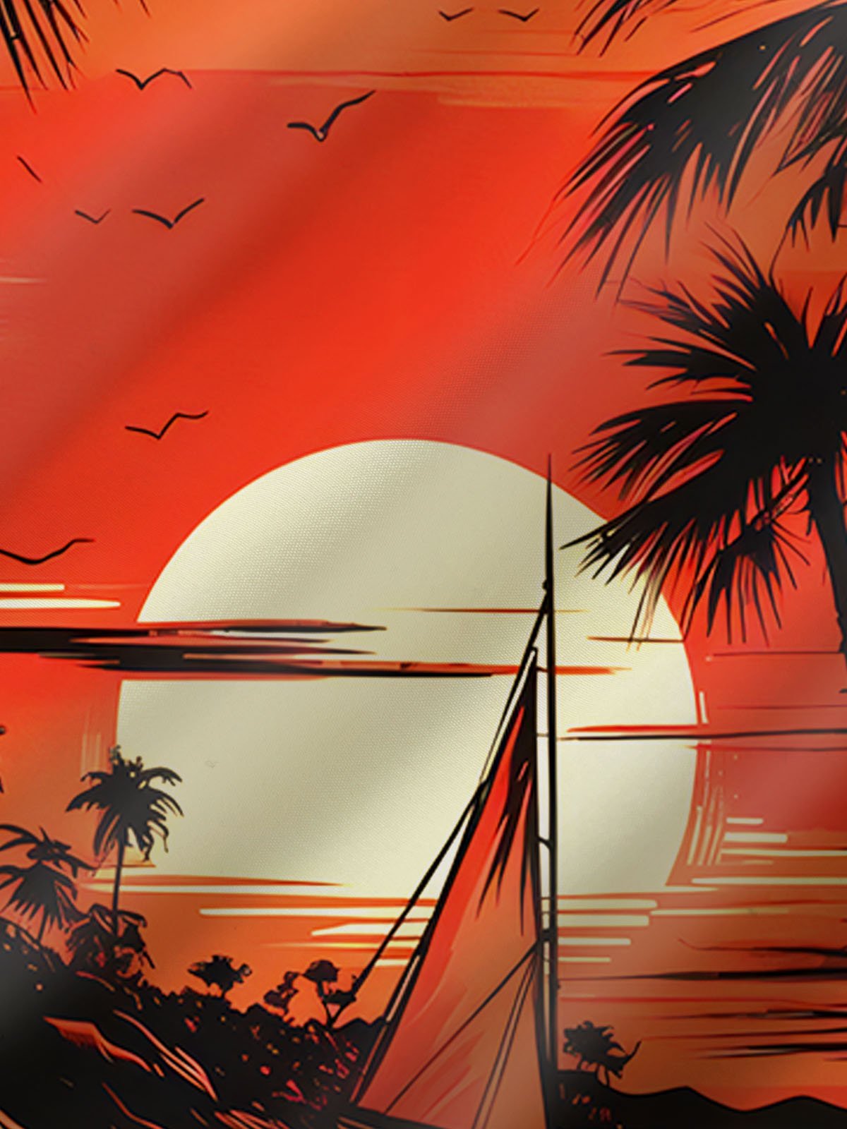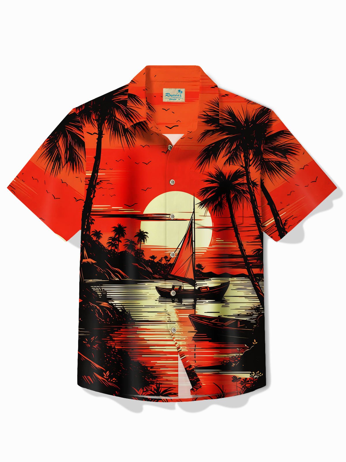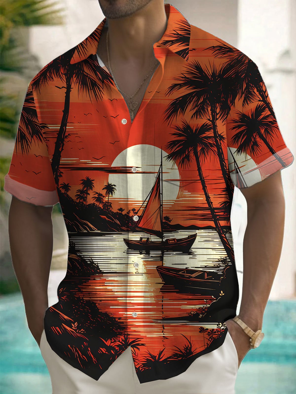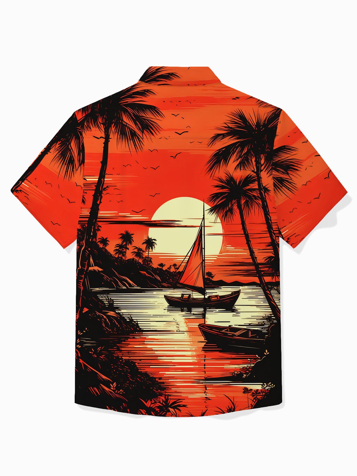 Alohadaddy Hawaiian Coconut Tree Sunset Landscape Print Men's Button Pocket Short Sleeve Shirt