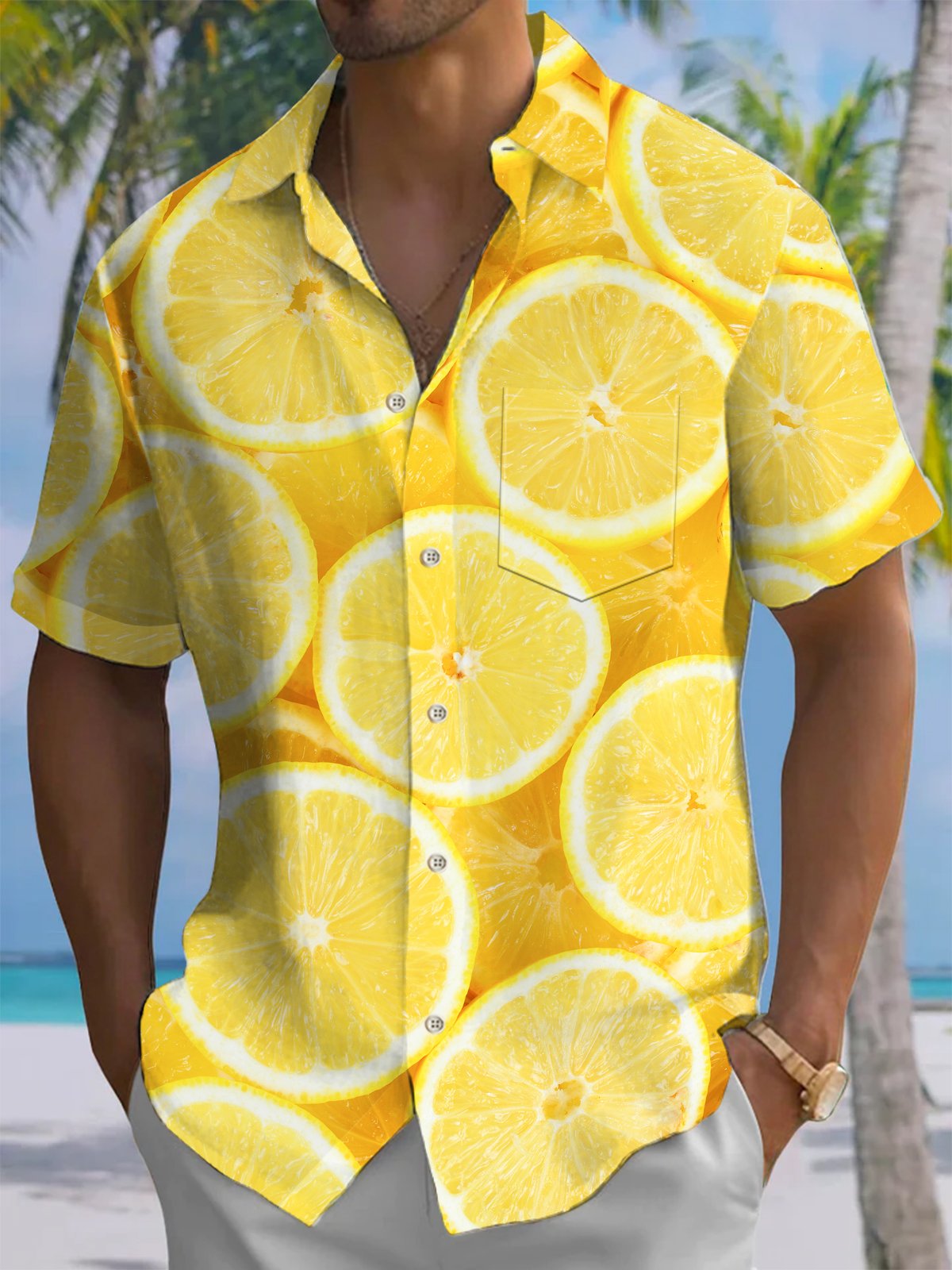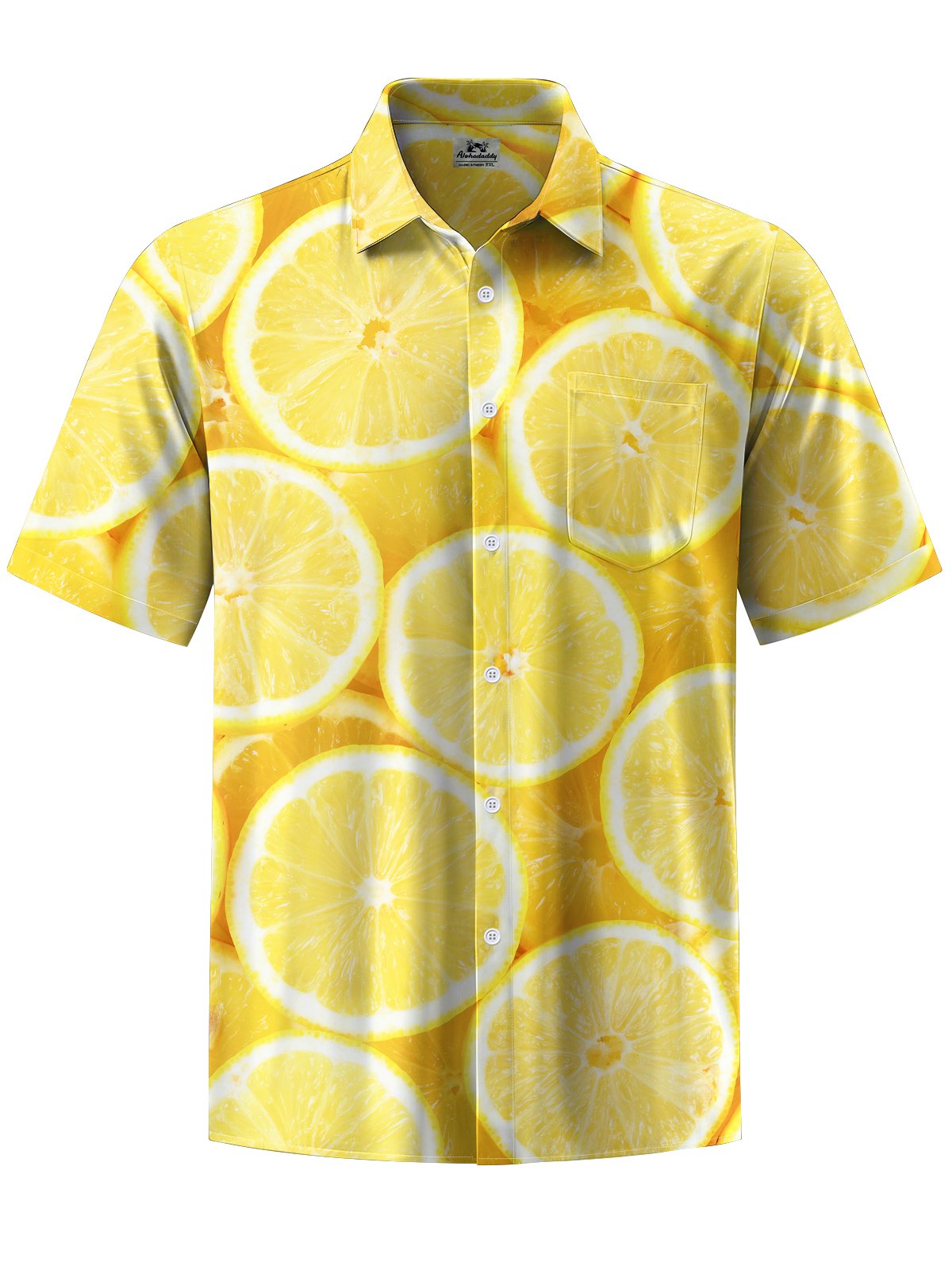 Alohadaddy® Hawaiian Lemon Art Print Chest Pocket Men's Short Sleeve Shirt Big & Tall