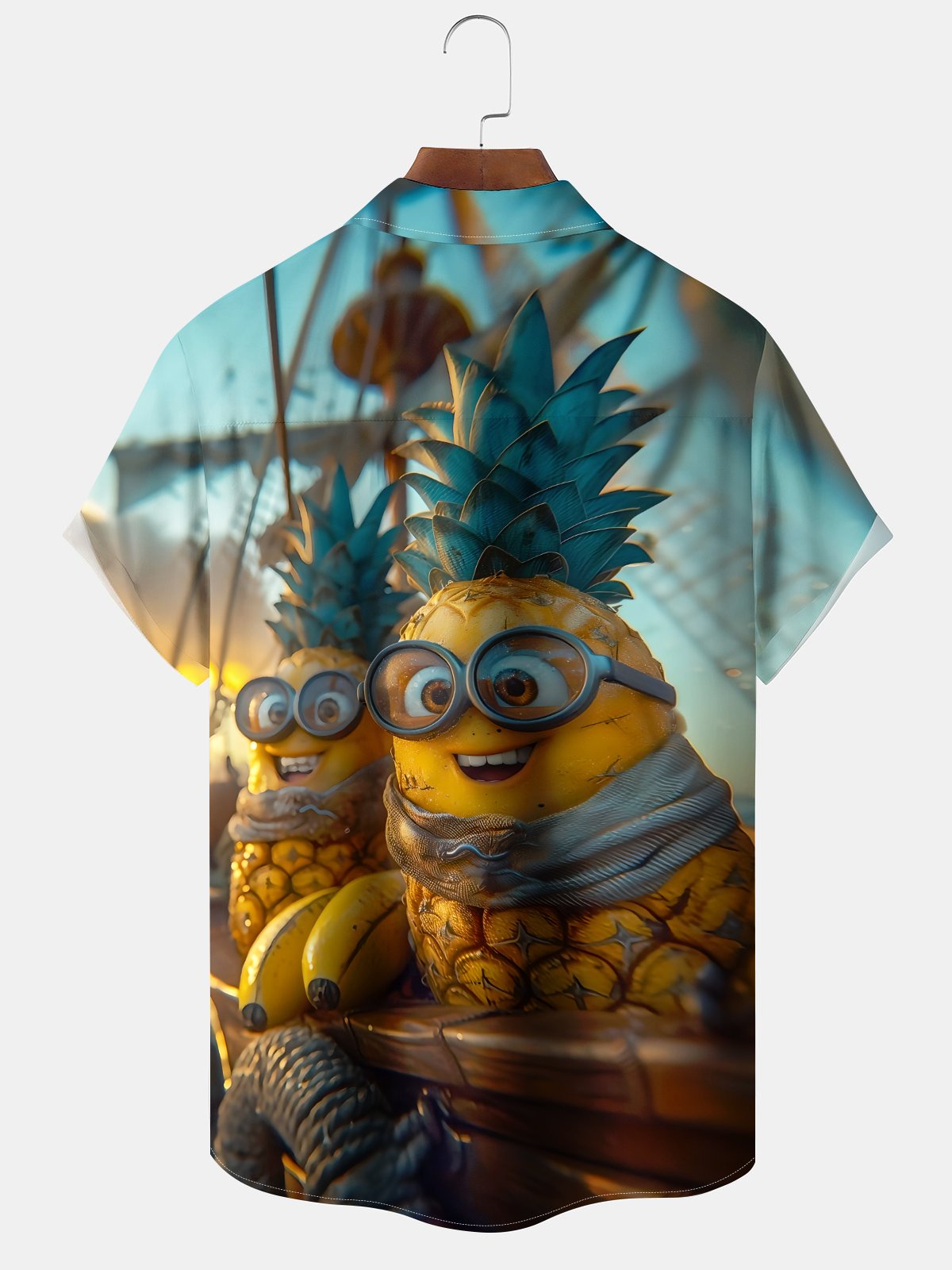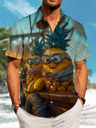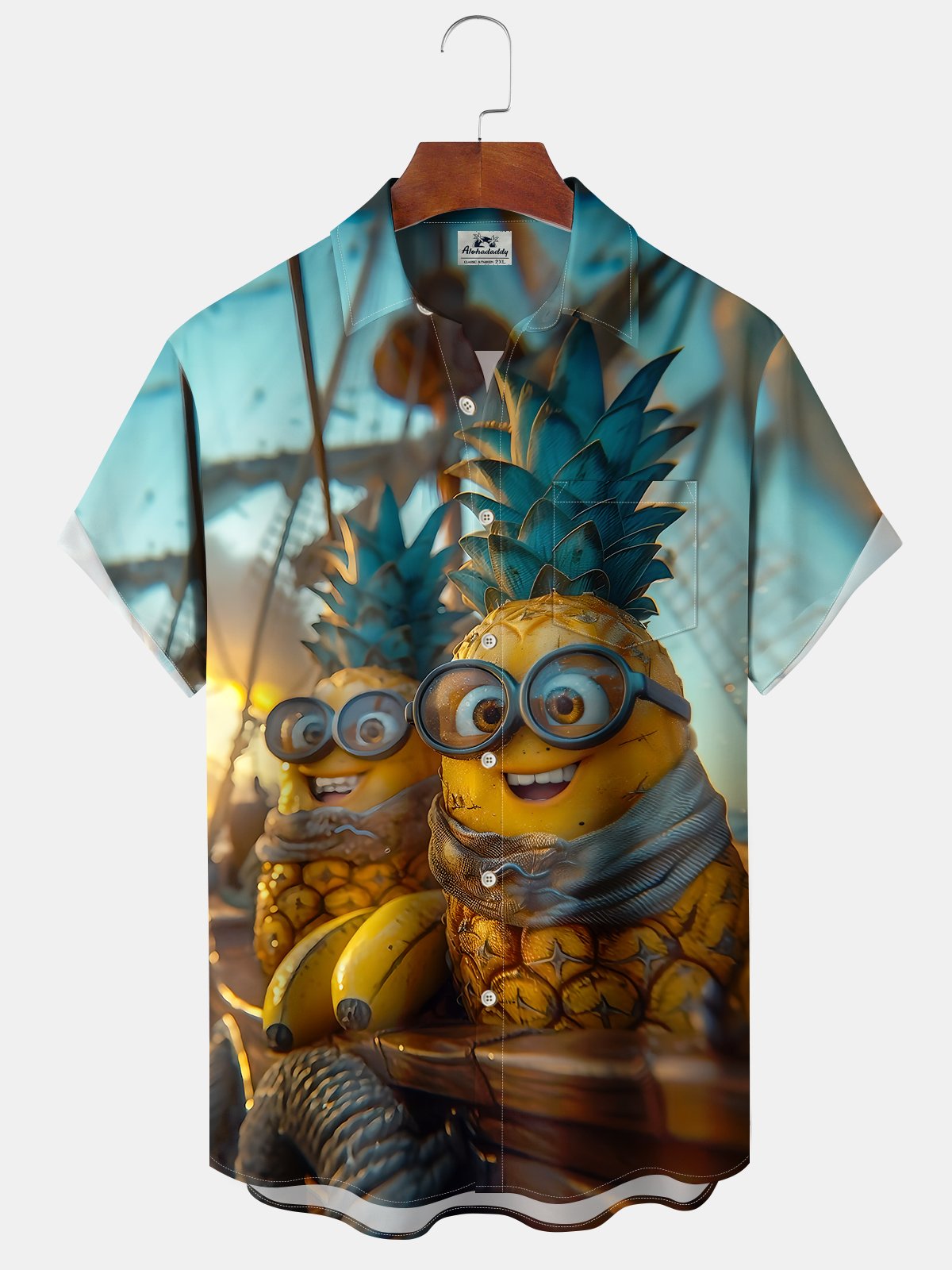 Alohadaddy Hawaiian Casual Pineapple Minions Captain Button Cardigan Pocket Stretch Large Size Polyester Short Sleeve Shirt