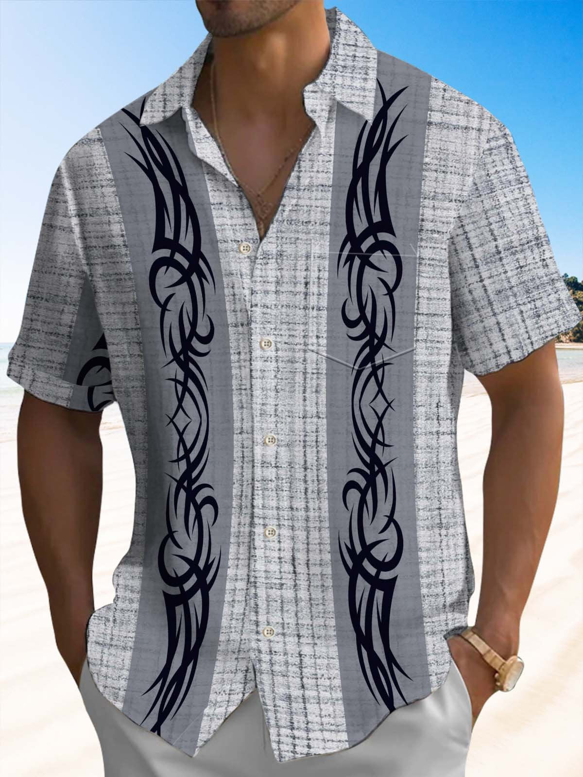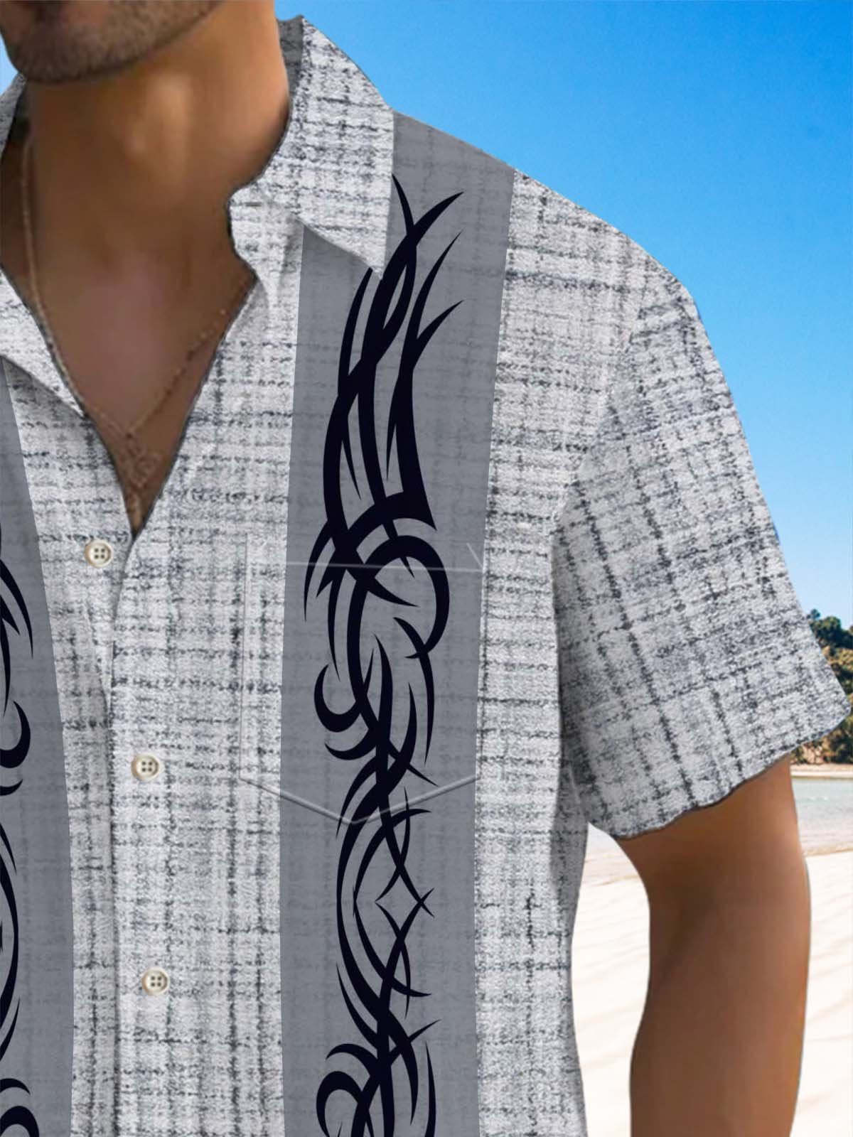 Alohadaddy® Casual Striped Maori Tattoo Art Print Chest Pocket Stretch Men's Short Sleeve Shirt Big & Tall