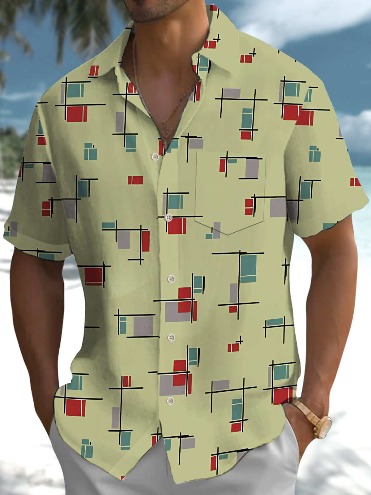 Alohadaddy® Retro Geometric Print Button Pocket Stretch Men's Short Sleeve Shirt Big & Tall
