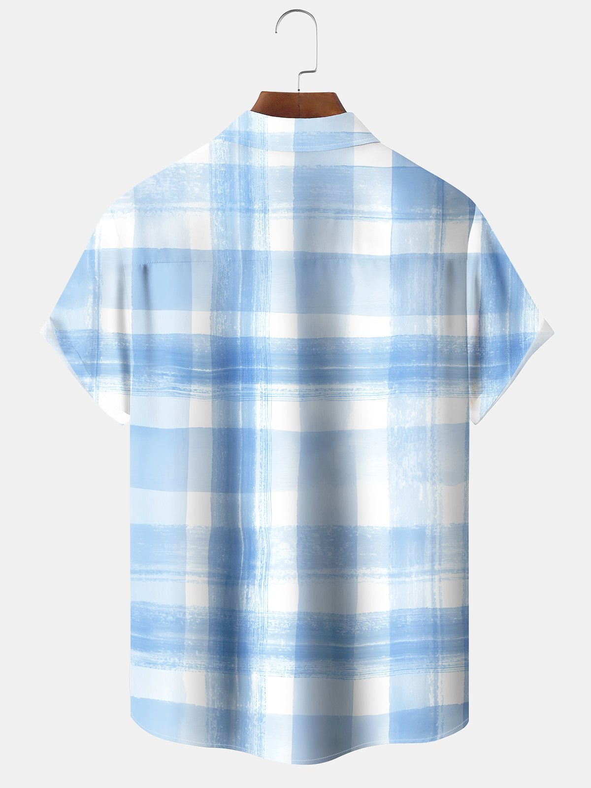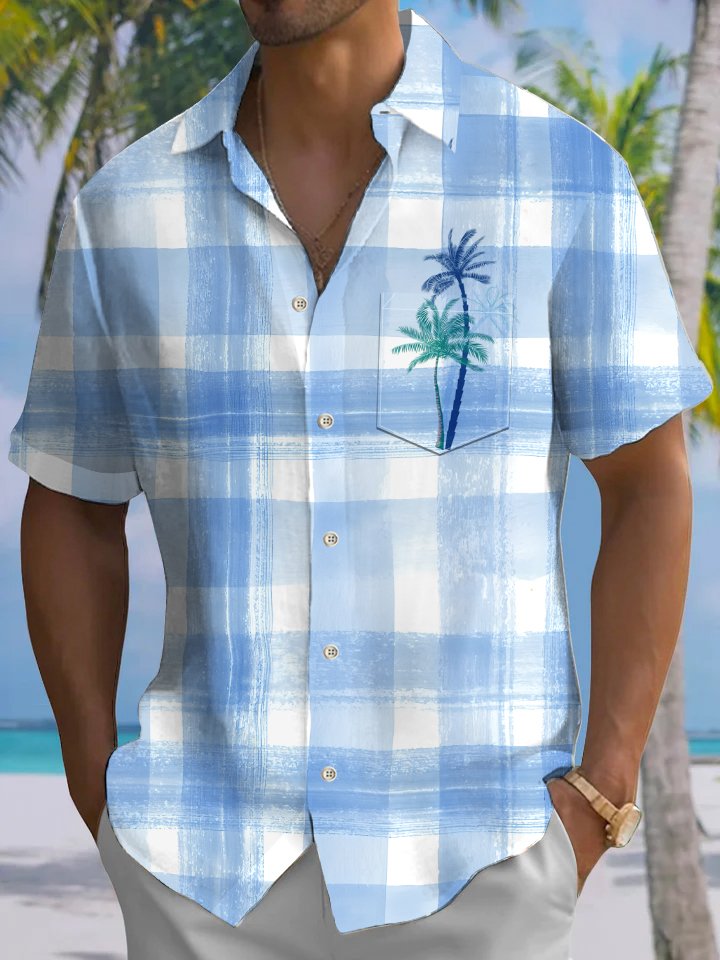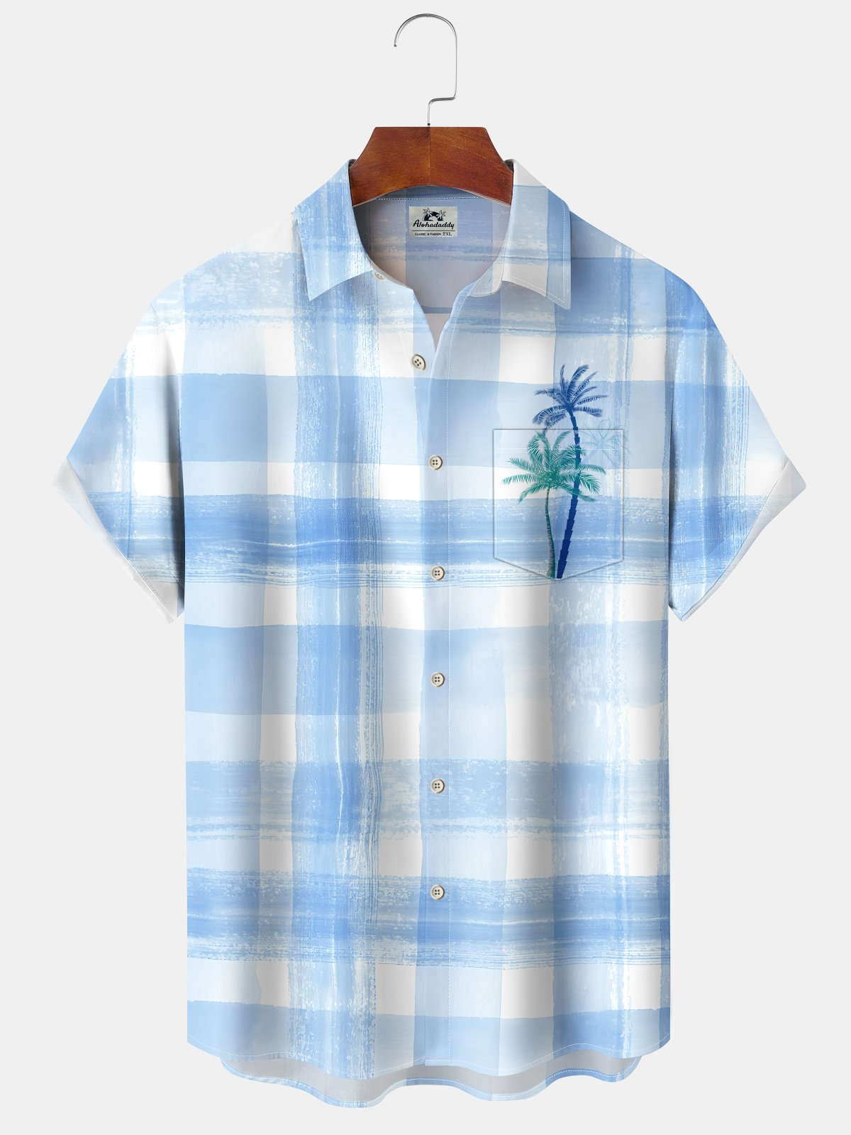 Alohadaddy Casual Everyday Plaid Palm Trees Print Art Stretch Oversized Button Cardigan Polyester Short Sleeve Shirt