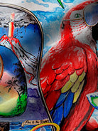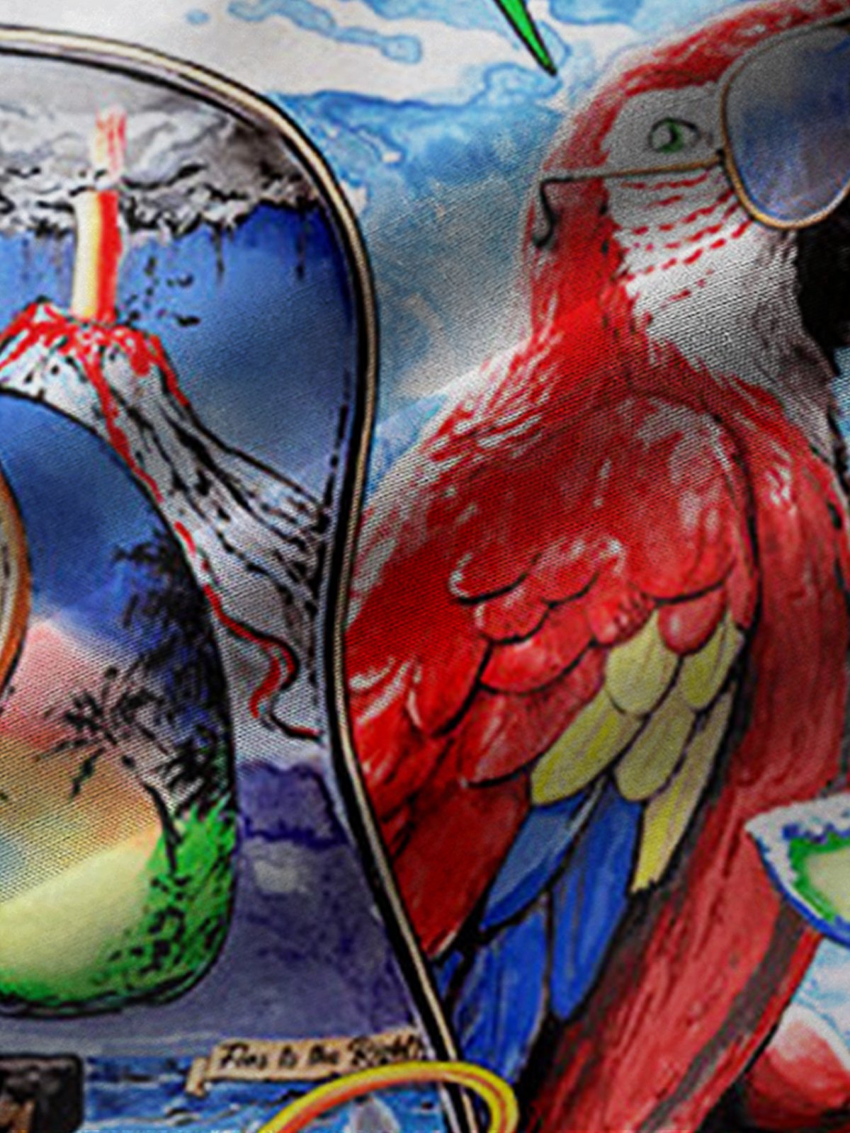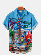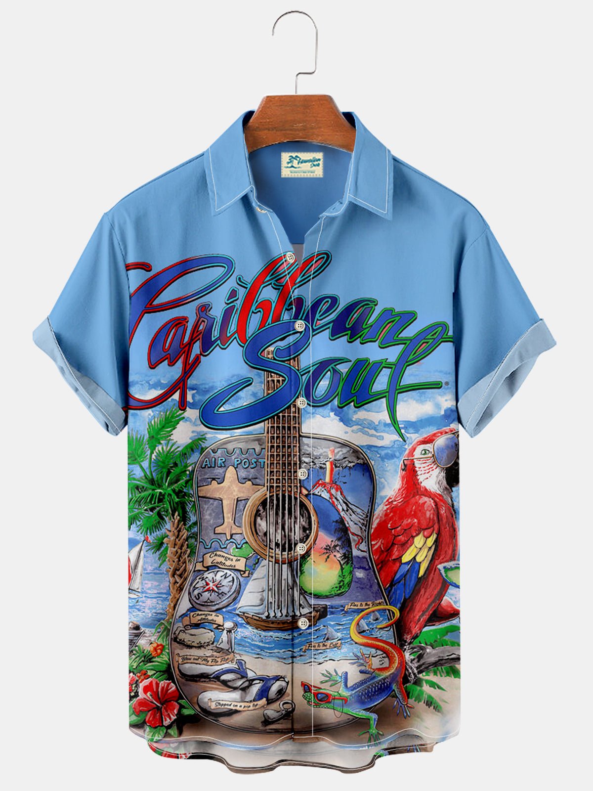 Chemises des Caraïbes pour hommes Alohadaddy Pirate, instrument de musique, imprimé perroquet, poche poitrine, chemise de vacances, chemise bleue surdimensionnée