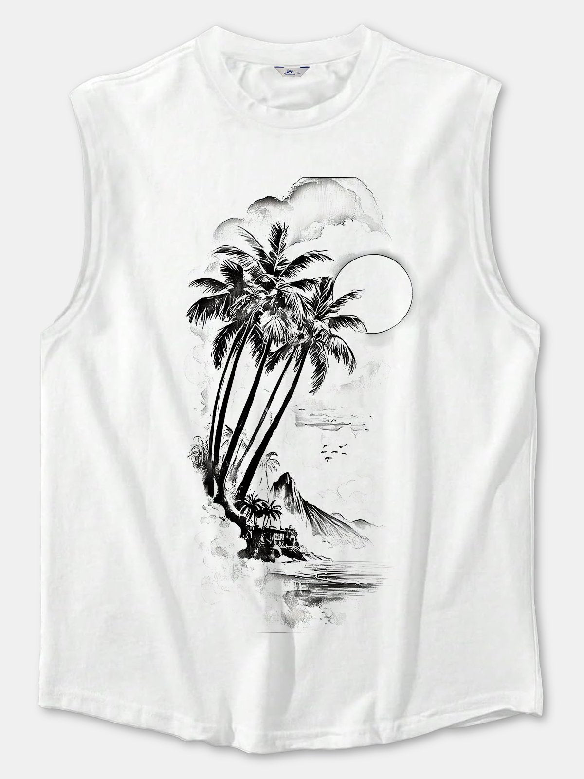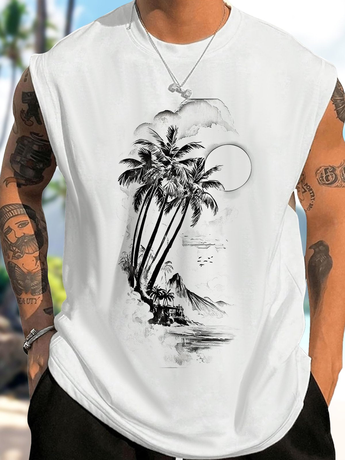 Alohadaddy Casual Hawaii Palm Tree Beach Print Art Round Neck Stretch Large Size Sleeveless T-Shirt Tank Top