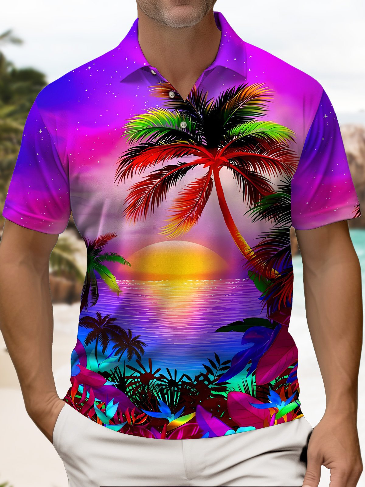 Alohadaddy® Hawaii Sunset Beach Palm Trees Print Art Men's Short Sleeve Polo Big & Tall