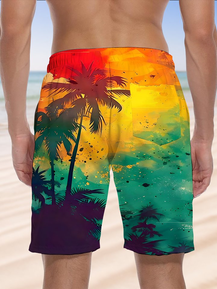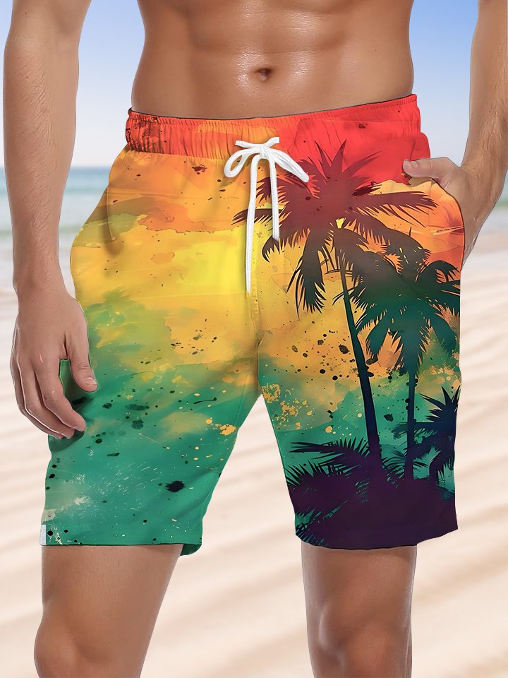 Alohadaddy Hawaiian Casual Palm Trees Gradient Color Painting Art Elastic Waist Drawstring Polyester Stretch Beach Shorts