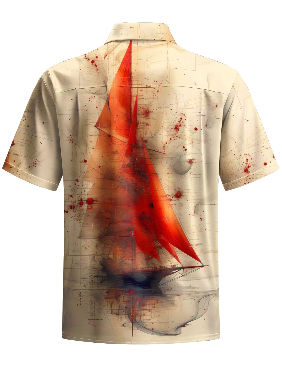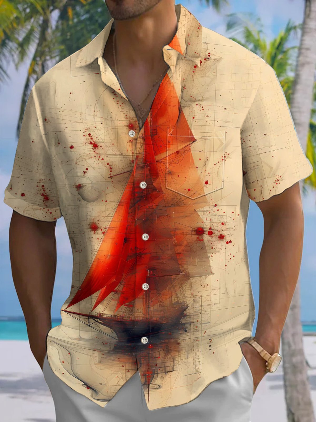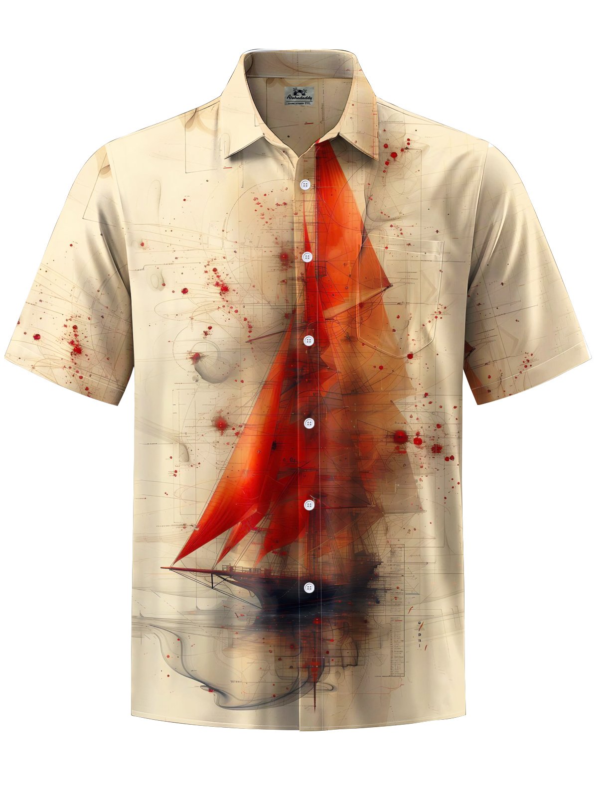 Alohadaddy® Casual Sailboat Printed Chest Pocket Stretch Men's Short Sleeve Shirt Big & Tall