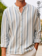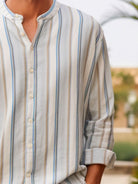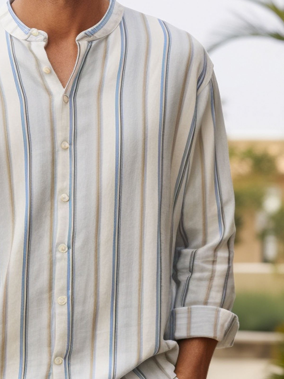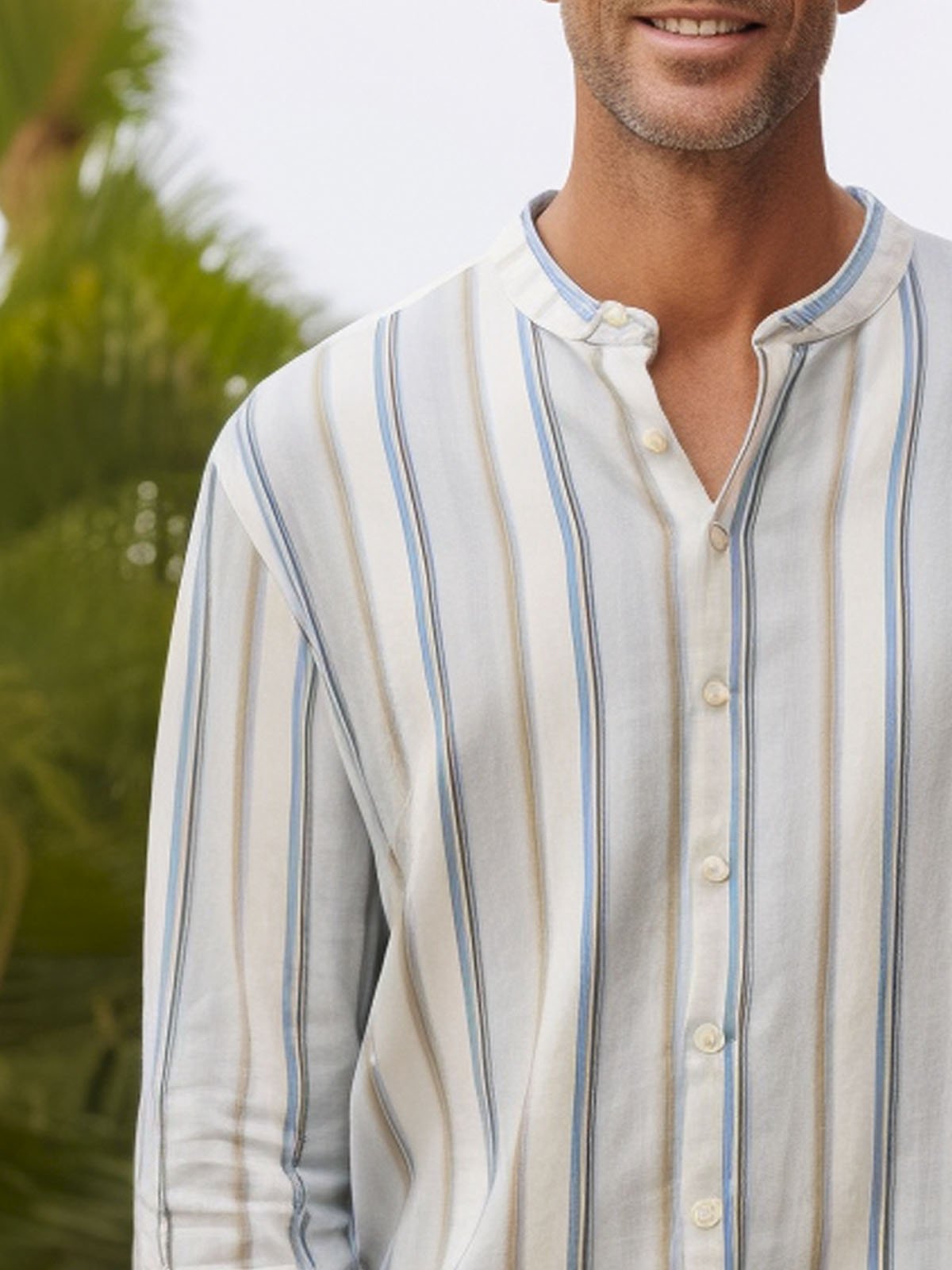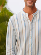 Alohadaddy Beach Vacation Off-White Men's Long Sleeve Stand Collar Striped Shirt Wrinkle Free Seersucker Stretch Plus Size Aloha Camp Button-Down Shirts