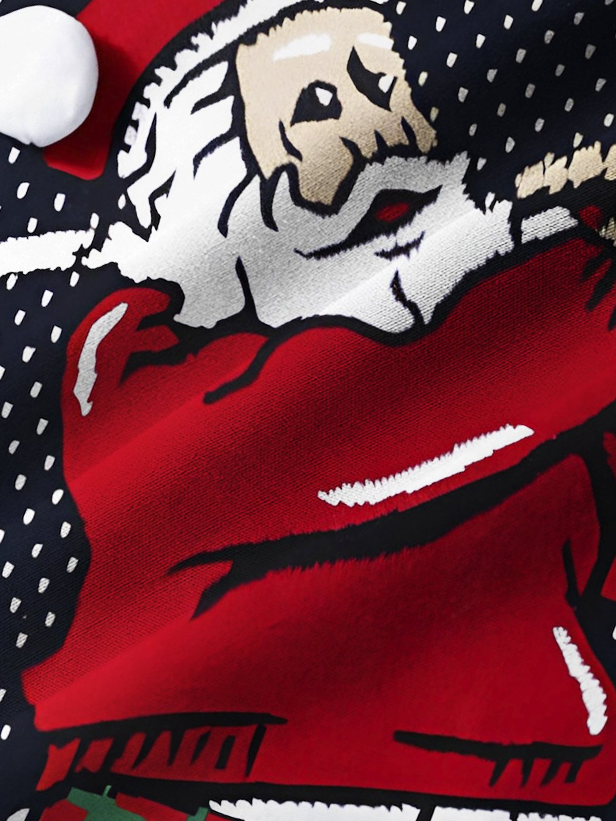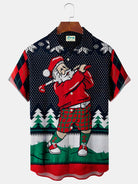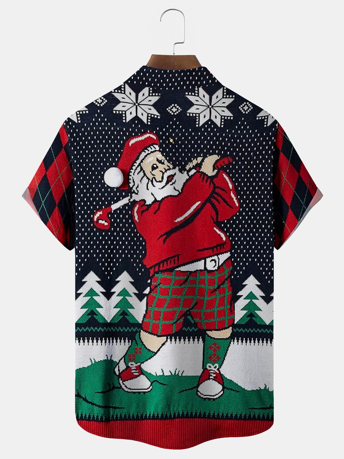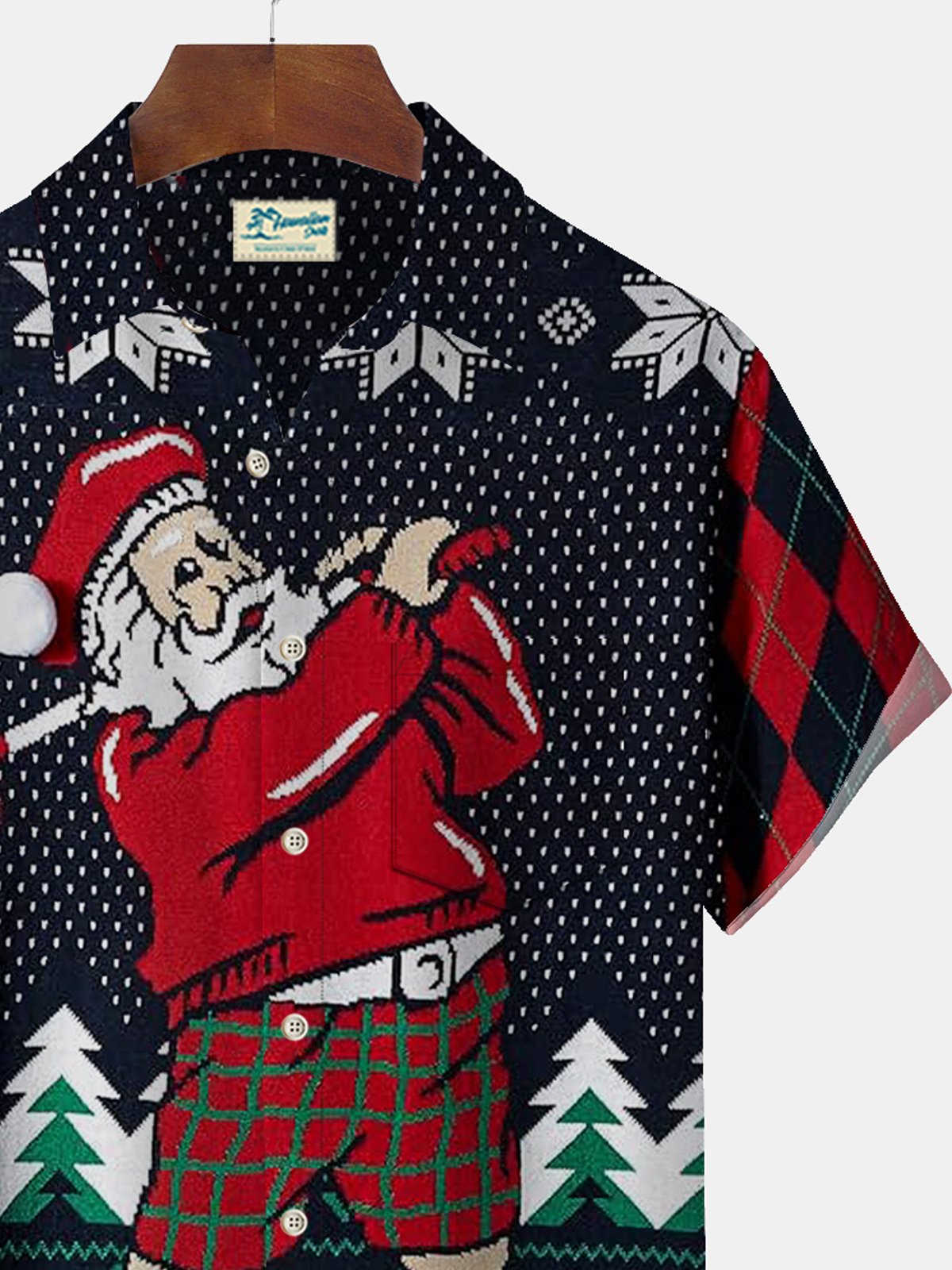 Alohadaddy Christmas Holiday Blue Men's Fun Cartoon Santa Golf Art Check Camp Pocket Shirts Big Tall