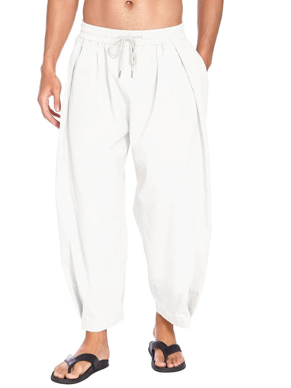 Alohadaddy Drawstring Pockets Cotton Linen Loose Casual Beach Lantern Harem Capri Pants