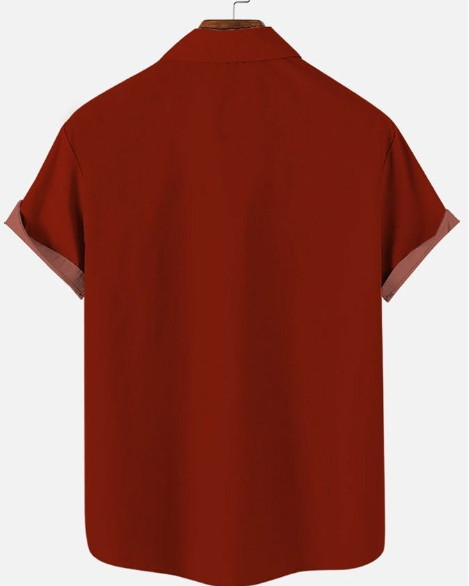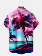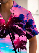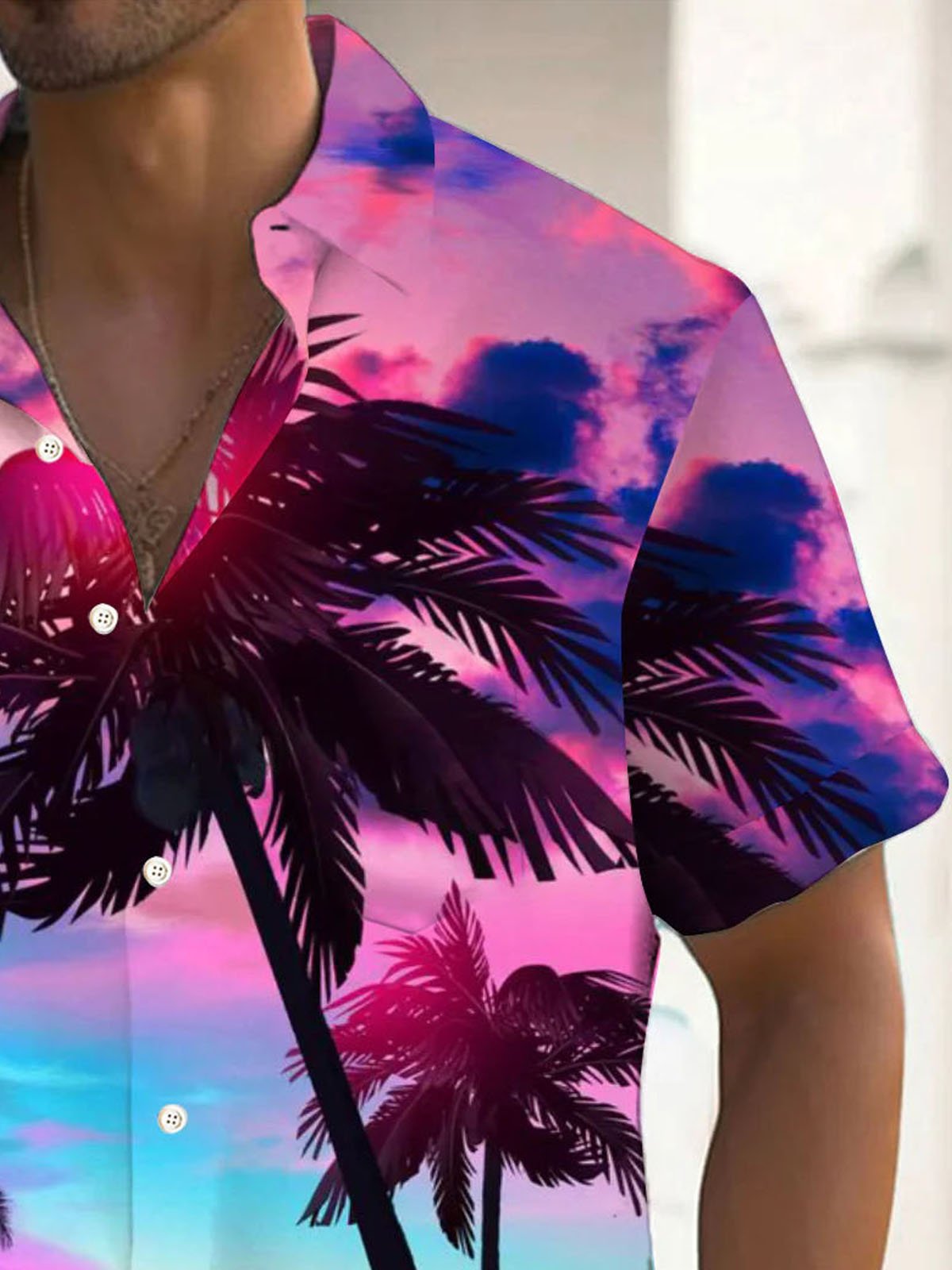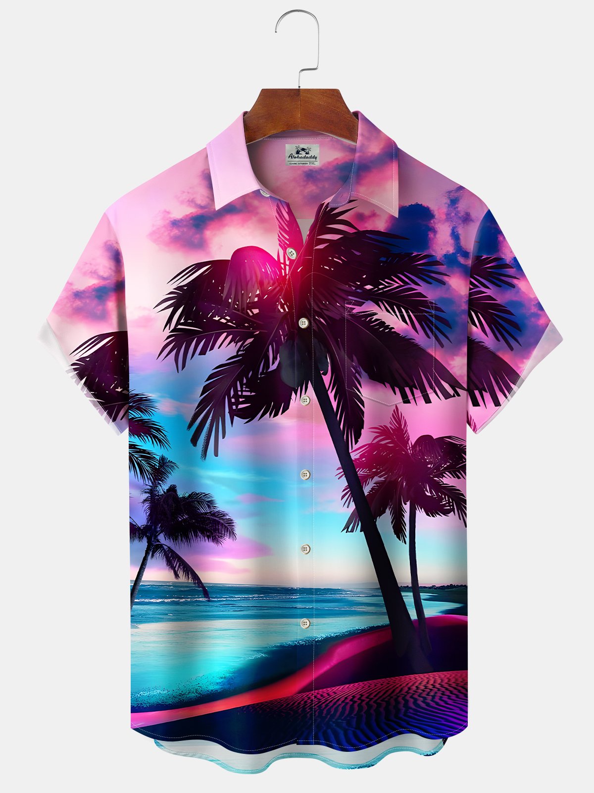 Alohadaddy Hawaiian Coconut Tree Gradient Sunset Landscape Print Men's Button Pocket Short Sleeve Shirt